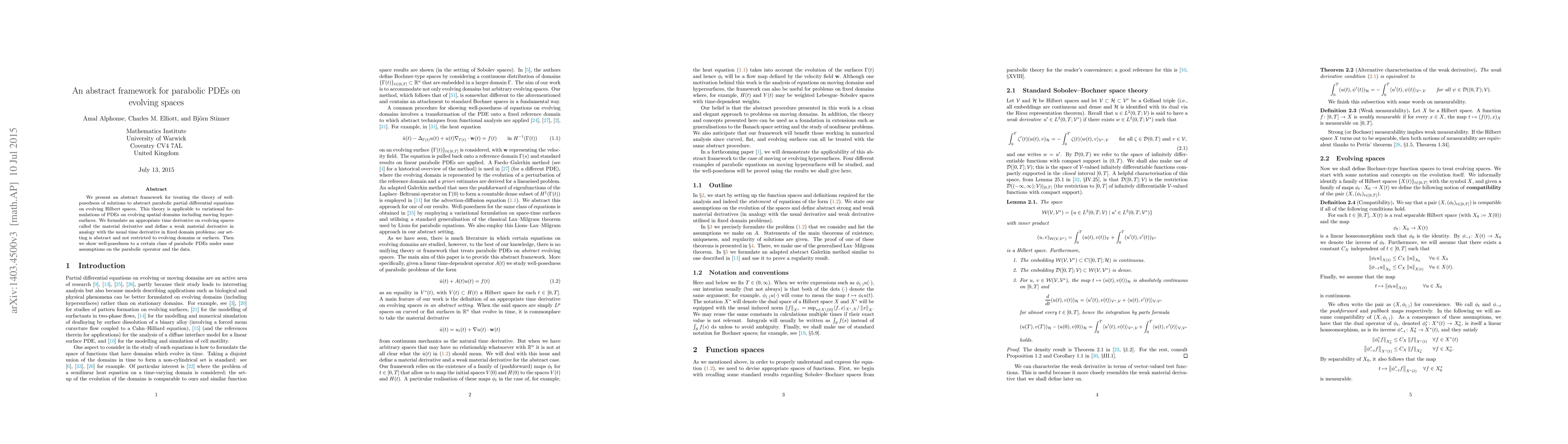 This paper develops an abstract framework for parabolic PDEs on evolving Hilbert spaces, introducing a material derivative and proving well-posedness for a class of PDEs under specified conditions on the parabolic operator and data.