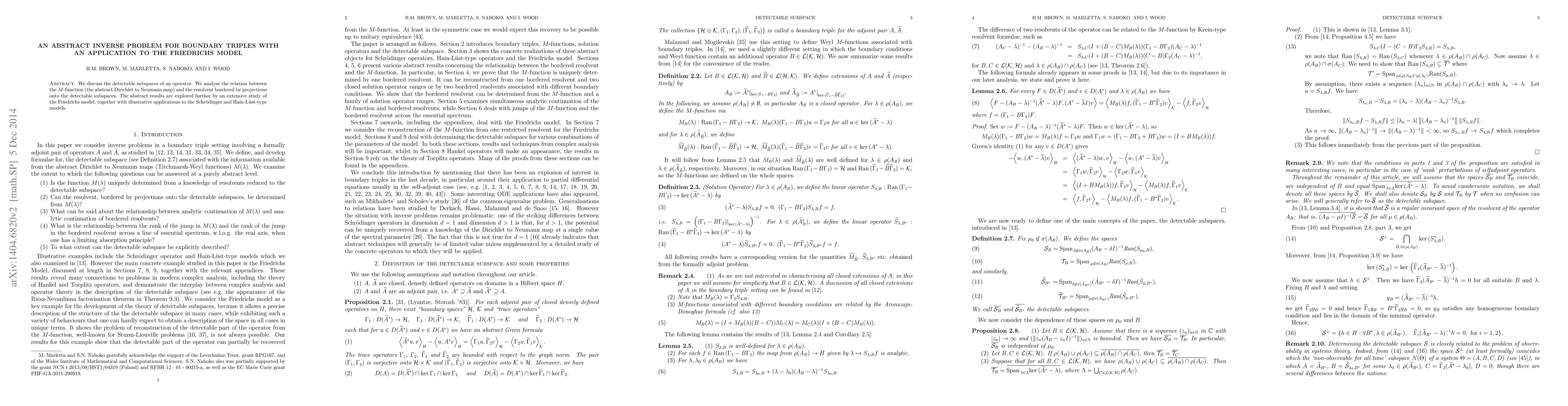 We discuss the detectable subspaces of an operator. We analyse the relation between the M-function (the abstract Dirichlet to Neumann map) and the resolvent bordered by projections onto the detectable subspaces. The abstract results are explored further by an extensive study of the Friedrichs model, together with illustrative applications to the Schroedinger and Hain-Luest-type models.
