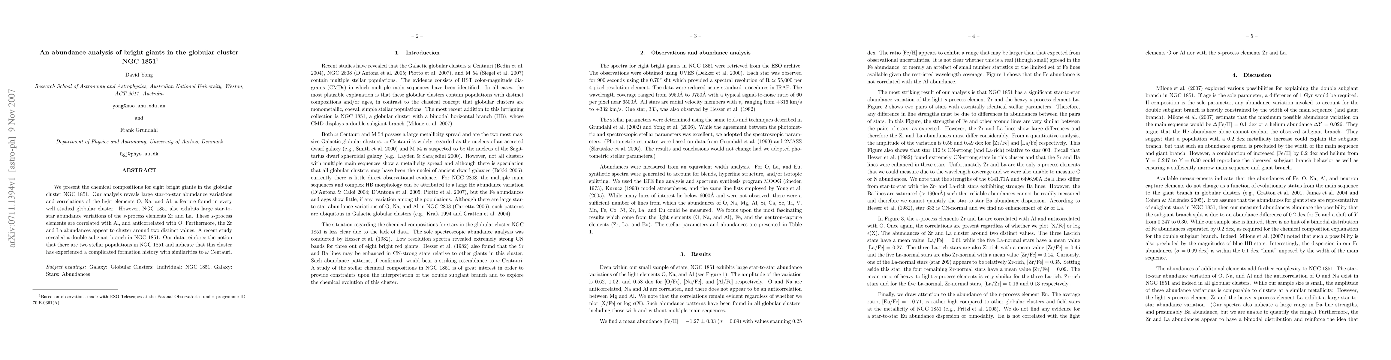 We present the chemical compositions for eight bright giants in the globular cluster NGC 1851. Our analysis reveals large star-to-star abundance variations and correlations of the light elements O, Na, and Al, a feature found in every well studied globular cluster. However, NGC 1851 also exhibits large star-to-star abundance variations of the s-process elements Zr and La. These s-process elements are correlated with Al, and anticorrelated with O. Furthermore, the Zr and La abundances appear to cluster around two distinct values. A recent study revealed a double subgiant branch in NGC 1851. Our data reinforce the notion that there are two stellar populations in NGC 1851 and indicate that this cluster has experienced a complicated formation history with similarities to omega Centauri.