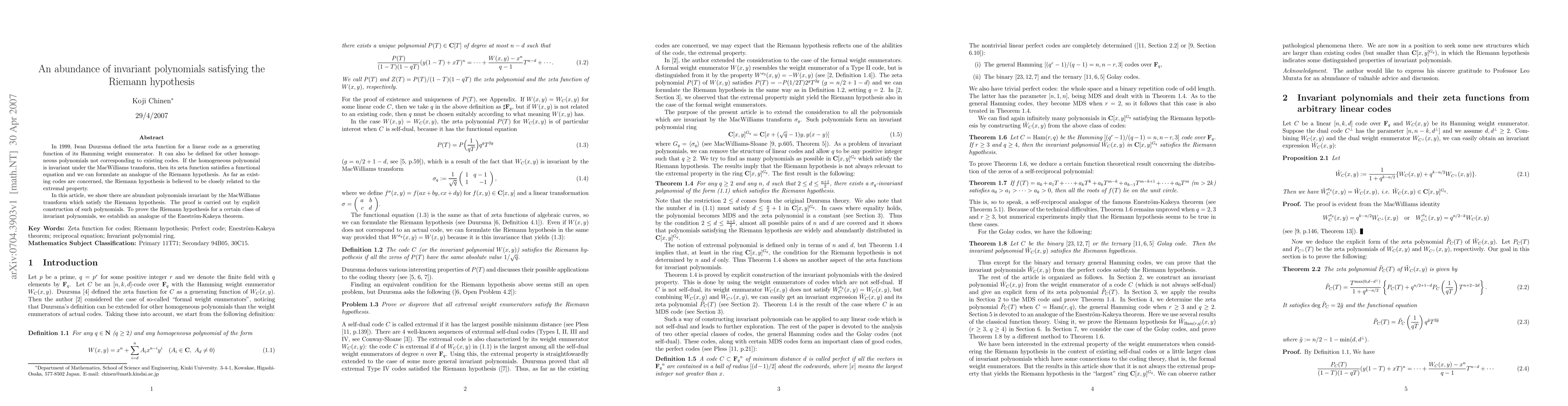 In 1999, Iwan Duursma defined the zeta function for a linear code as a generating function of its Hamming weight enumerator. It can also be defined for other homogeneous polynomials not corresponding to existing codes. If the homogeneous polynomial is invariant under the MacWilliams transform, then its zeta function satisfies a functional equation and we can formulate an analogue of the Riemann hypothesis. As far as existing codes are concerned, the Riemann hypothesis is believed to be closely related to the extremal property. In this article, we show there are abundant polynomials invariant by the MacWilliams transform which satisfy the Riemann hypothesis. The proof is carried out by explicit construction of such polynomials. To prove the Riemann hypothesis for a certain class of invariant polynomials, we establish an analogue of the Enestr"om-Kakeya theorem.