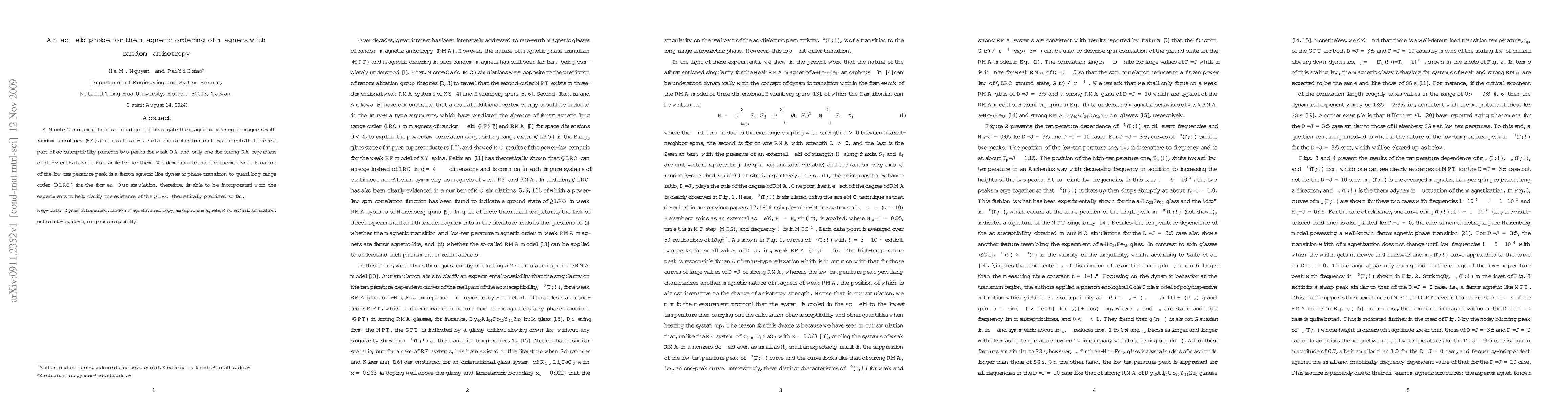 A Monte Carlo simulation is carried out to investigate the magnetic ordering in magnets with random anisotropy (RA). Our results show peculiar similarities to recent experiments that the real part of ac susceptibility presents two peaks for weak RA and only one for strong RA regardless of glassy critical dynamics manifested for them. We demonstrate that the thermodynamic nature of the low-temperature peak is a ferromagnetic-like dynamic phase transition to quasi-long range order (QLRO) for the former. Our simulation, therefore, is able to be incorporated with the experiments to help clarify the existence of the QLRO theoretically predicted so far.