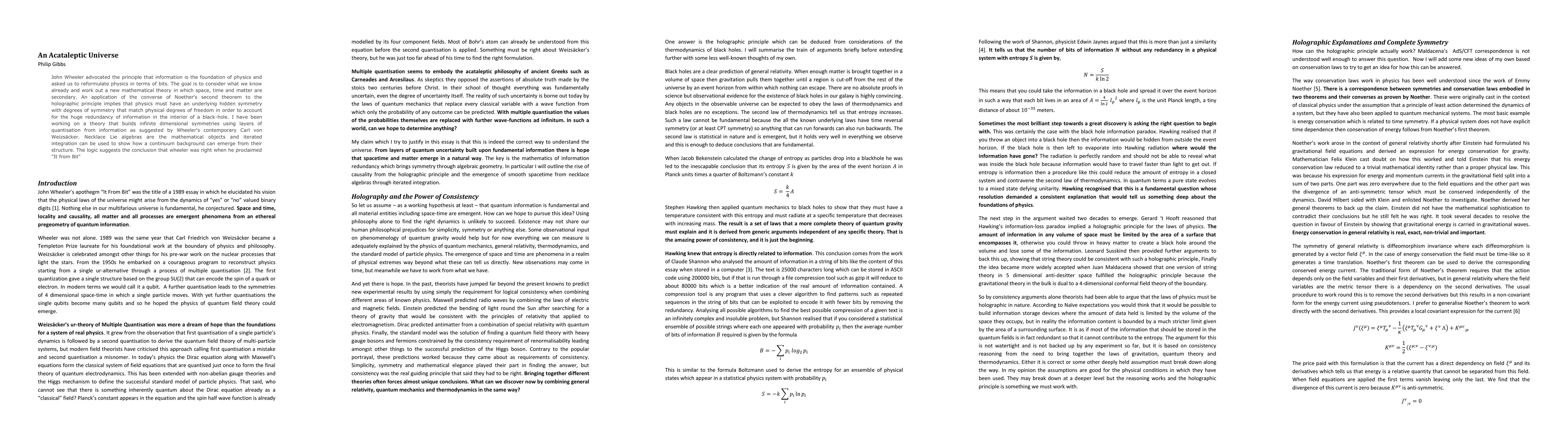 John Wheeler advocated the principle that information is the foundation of physics and asked us to reformulate physics in terms of bits. The goal is to consider what we know already and work out a new mathematical theory in which space, time and matter are secondary. An application of the converse of Noether's second theorem to the holographic principle implies that physics must have an underlying hidden symmetry with degrees of symmetry that match physical degrees of freedom in order to account for the huge redundancy of information in the interior of a black-hole. I have been working on a theory that builds infinite dimensional symmetries using layers of quantisation from information as suggested by Wheeler's contemporary Carl von Weizs\"acker. Necklace Lie algebras are the mathematical objects and iterated integration can be used to show how a continuum background can emerge from their structure. The logic suggests the conclusion that wheeler was right when he proclaimed "It from Bit"