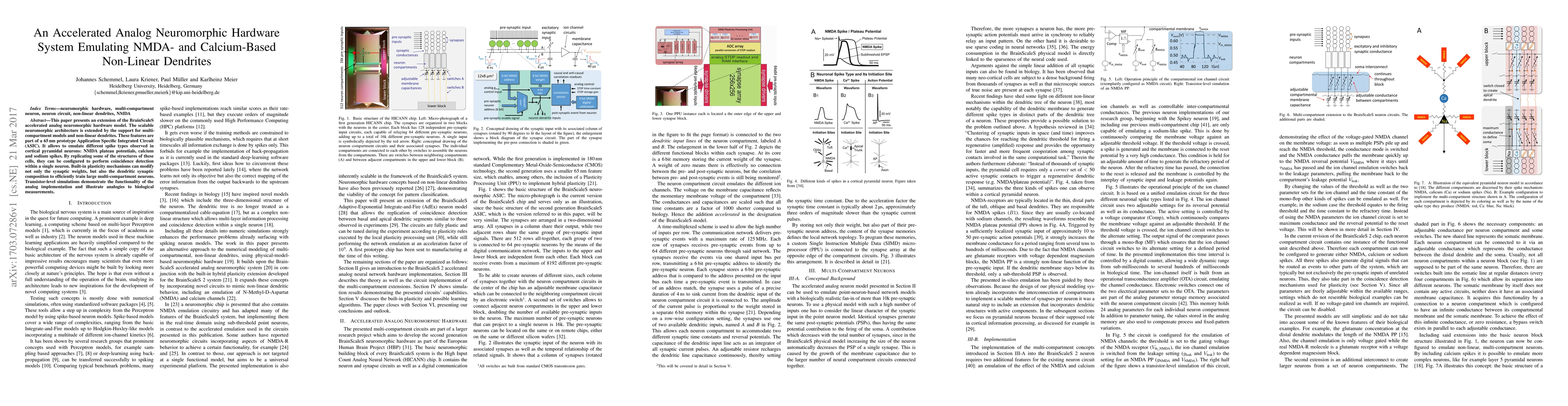 This paper introduces an advanced neuromorphic hardware system that emulates NMDA- and calcium-based non-linear dendrites, extending the BrainScaleS model to support multi-compartment neurons. The prototype ASIC enables the replication of various spike types and incorporates plasticity mechanisms for efficient training.