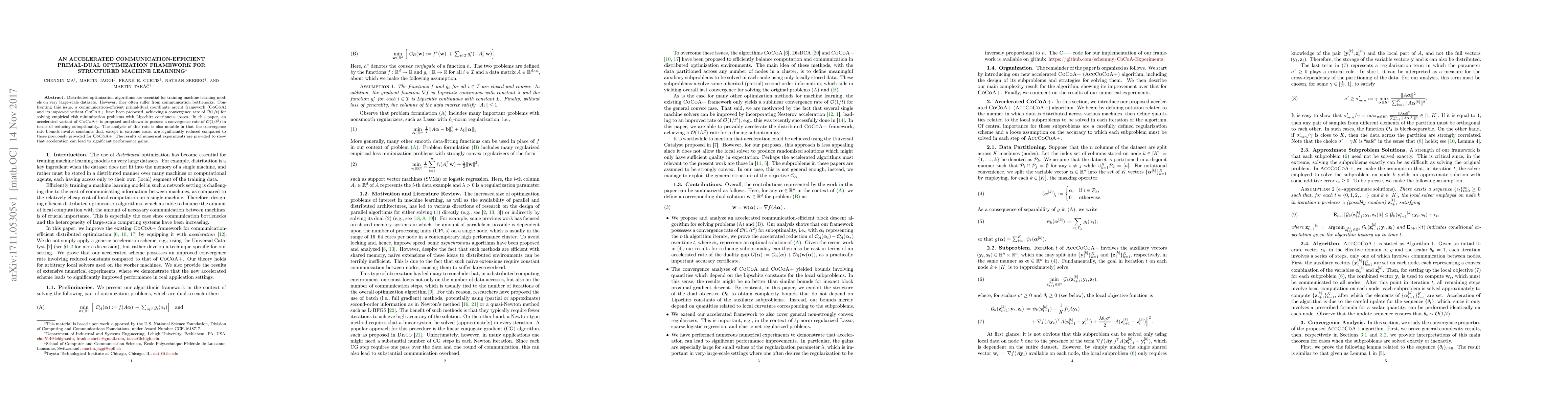 This paper proposes an accelerated variant of the communication-efficient primal-dual optimization framework CoCoA+, achieving a faster convergence rate of $\mathcal{O}(1/t^2)$ for large-scale machine learning model training. Numerical experiments demonstrate significant performance improvements over the original CoCoA+ method.