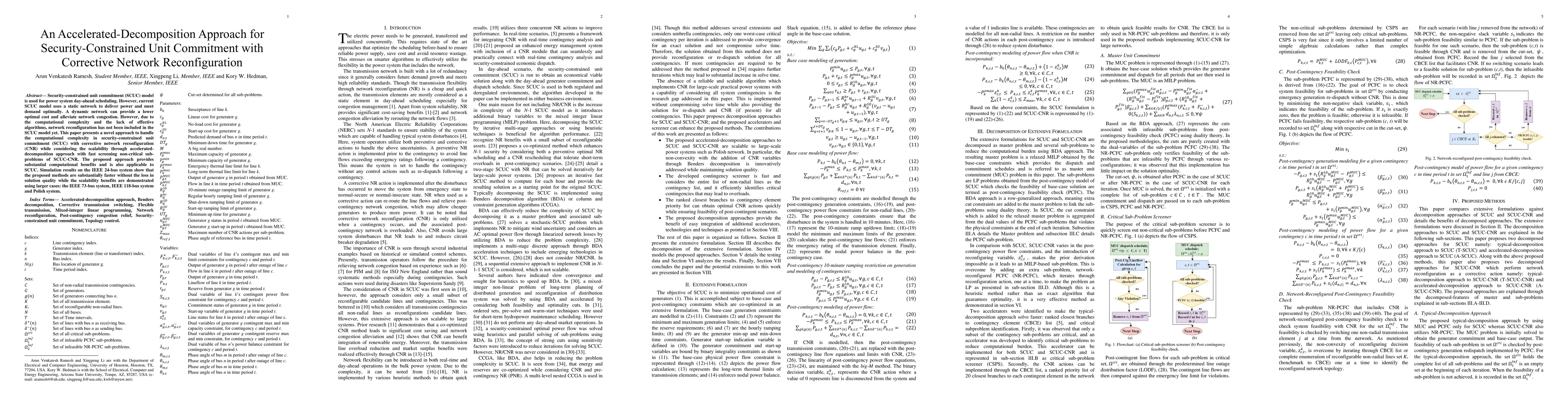 This paper introduces a novel accelerated-decomposition approach for security-constrained unit commitment with corrective network reconfiguration, addressing computational complexity and scalability. Simulation results show significant speed improvements without compromising solution quality, validated across multiple systems.