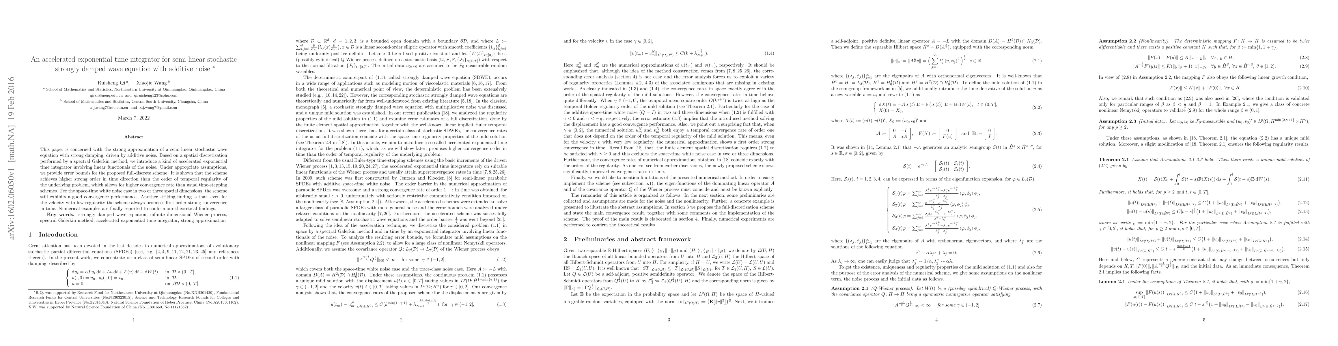This paper is concerned with the strong approximation of a semi-linear stochastic wave equation with strong damping, driven by additive noise. Based on a spatial discretization performed by a spectral Galerkin method, we introduce a kind of accelerated exponential time integrator involving linear functionals of the noise. Under appropriate assumptions, we provide error bounds for the proposed full-discrete scheme. It is shown that the scheme achieves higher strong order in time direction than the order of temporal regularity of the underlying problem, which allows for higher convergence rate than usual time-stepping schemes. For the space-time white noise case in two or three spatial dimensions, the scheme still exhibits a good convergence performance. Another striking finding is that, even for the velocity with low regularity the scheme always promises first order strong convergence in time. Numerical examples are finally reported to confirm our theoretical findings.