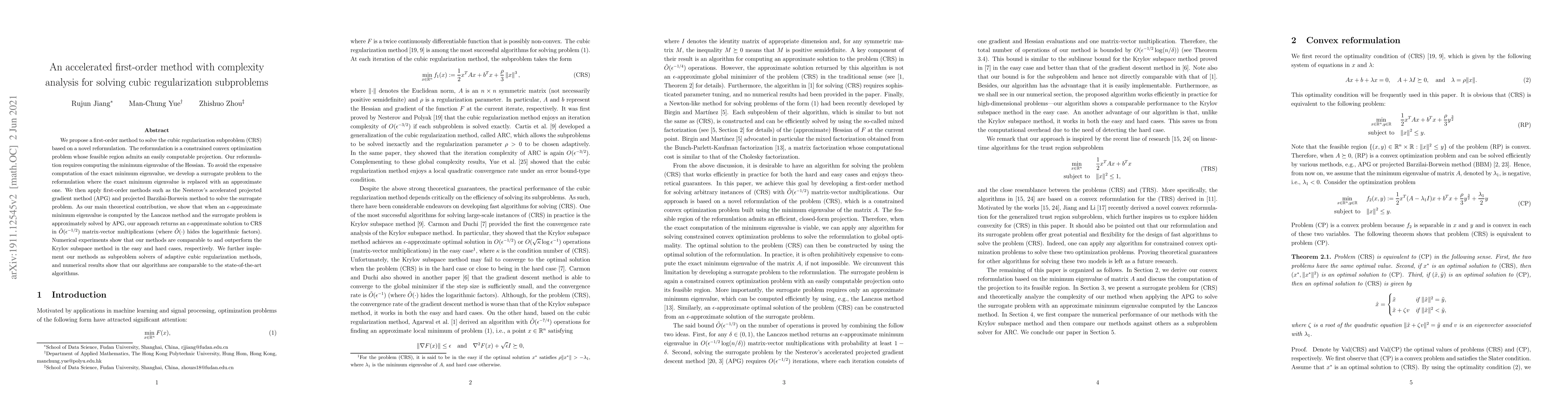 This paper introduces a first-order method to solve cubic regularization subproblems (CRS) using a novel reformulation and surrogate problem to approximate expensive computations. Theoretical analysis shows efficient complexity, and numerical results demonstrate comparable or superior performance to existing methods.
