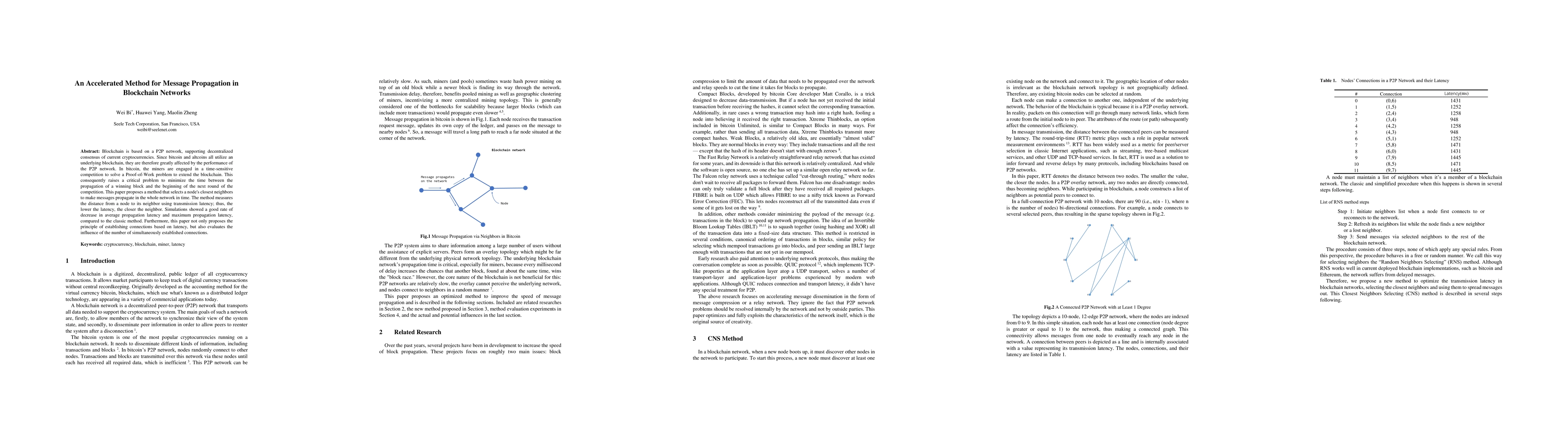 Blockchain is based on a P2P network, supporting decentralized consensus of current cryptocurrencies. Since bitcoin and altcoins all utilize an underlying blockchain, they are therefore greatly affected by the performance of the P2P network. In bitcoin, the miners are engaged in a time-sensitive competition to solve a Proof-of-Work problem to extend the blockchain. This consequently raises a critical problem to minimize the time between the propagation of a winning block and the beginning of the next round of the competition. This paper proposes a method that selects a node's closest neighbors to make messages propagate in the whole network in time. The method measures the distance from a node to its neighbor using transmission latency; thus, the lower the latency, the closer the neighbor. Simulations showed a good rate of decrease in average propagation latency and maximum propagation latency, compared to the classic method. Furthermore, this paper not only proposes the principle of establishing connections based on latency, but also evaluates the influence of the number of simultaneously established connections.
