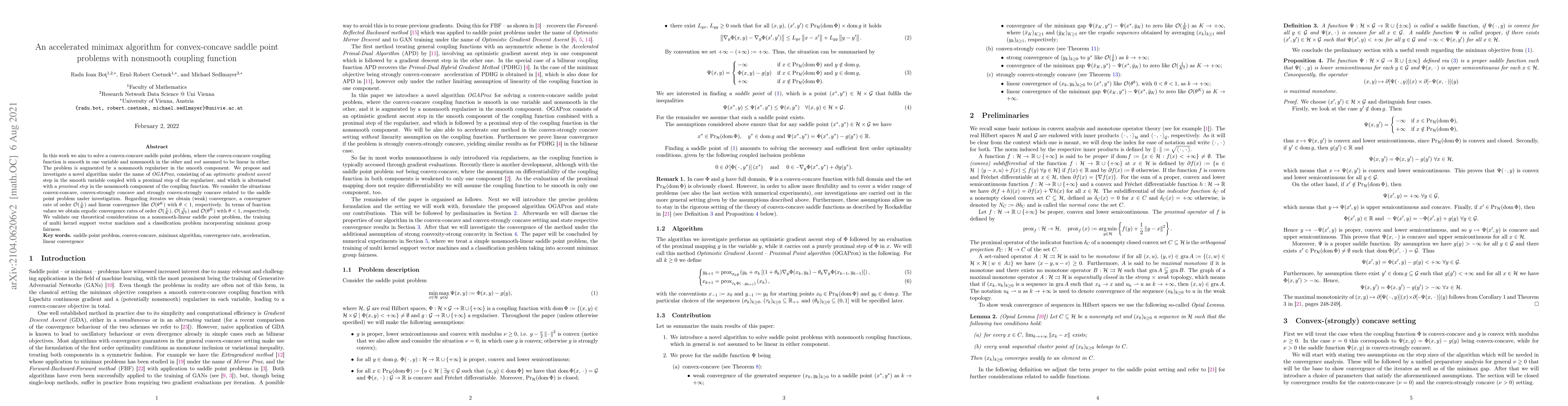 This paper proposes OGAProx, an accelerated minimax algorithm for solving convex-concave saddle point problems with a nonsmooth coupling function. The algorithm alternates between gradient ascent and proximal steps, achieving convergence rates and linear convergence under different problem conditions. The method is validated through applications in support vector machines and fairness-aware classification.