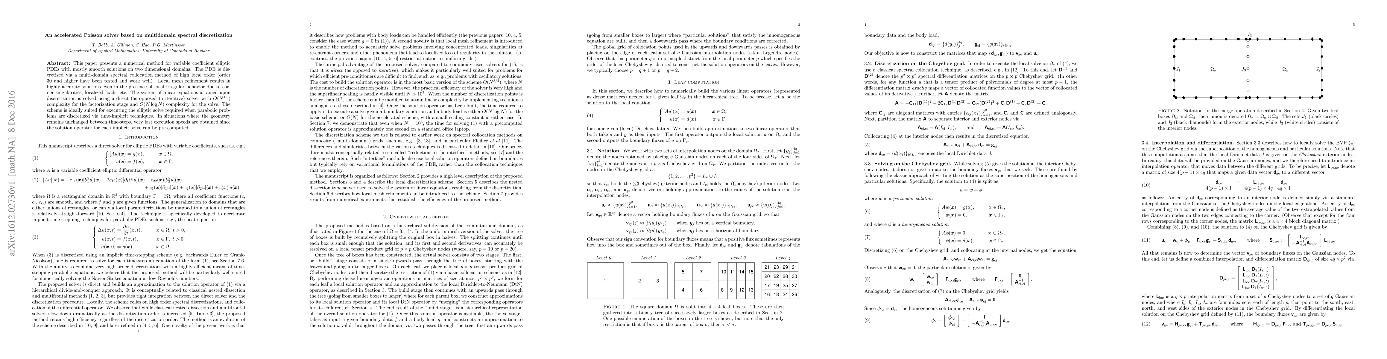 This paper presents a numerical method for variable coefficient elliptic PDEs with mostly smooth solutions on two dimensional domains. The PDE is discretized via a multi-domain spectral collocation method of high local order (order 30 and higher have been tested and work well). Local mesh refinement results in highly accurate solutions even in the presence of local irregular behavior due to corner singularities, localized loads, etc. The system of linear equations attained upon discretization is solved using a direct (as opposed to iterative) solver with $O(N^{1.5})$ complexity for the factorization stage and $O(N \log N)$ complexity for the solve. The scheme is ideally suited for executing the elliptic solve required when parabolic problems are discretized via time-implicit techniques. In situations where the geometry remains unchanged between time-steps, very fast execution speeds are obtained since the solution operator for each implicit solve can be pre-computed.