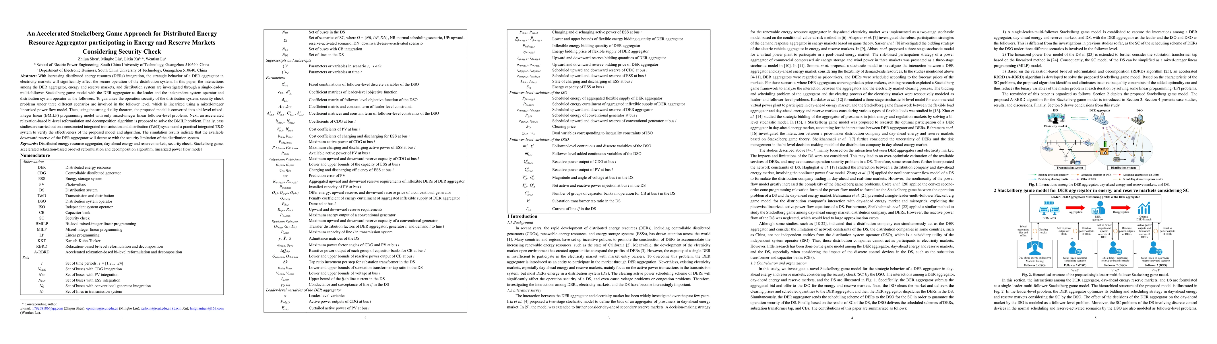 This paper proposes an accelerated Stackelberg game approach for a DER aggregator participating in energy and reserve markets, incorporating security checks to ensure distribution system operation. An accelerated relaxation-based algorithm is developed to solve the bi-level mixed-integer linear programming model, demonstrating reduced DER aggregator reserves under security constraints.