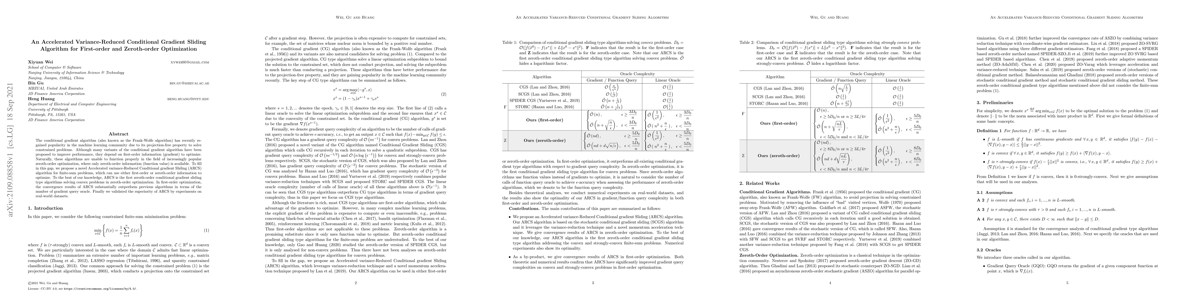 The paper introduces the Accelerated variance-Reduced Conditional gradient Sliding (ARCS) algorithm, which efficiently solves both first-order and zeroth-order optimization problems using either gradient or function value information. ARCS outperforms existing algorithms in first-order settings and is the first of its kind for zeroth-order optimization, validated through experiments on real-world datasets.