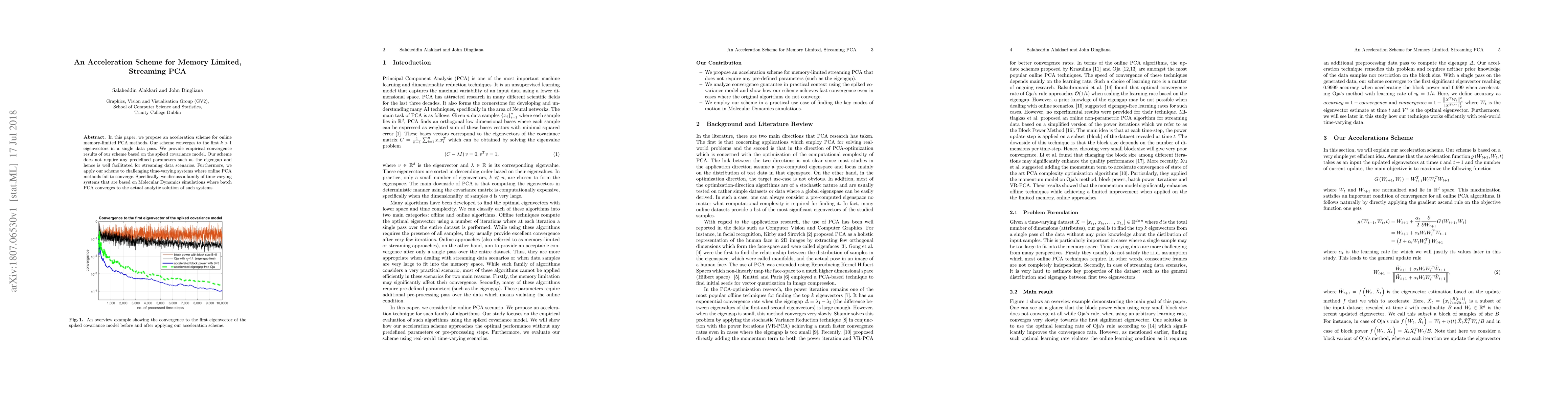 In this paper, we propose an acceleration scheme for online memory-limited PCA methods. Our scheme converges to the first $k>1$ eigenvectors in a single data pass. We provide empirical convergence results of our scheme based on the spiked covariance model. Our scheme does not require any predefined parameters such as the eigengap and hence is well facilitated for streaming data scenarios. Furthermore, we apply our scheme to challenging time-varying systems where online PCA methods fail to converge. Specifically, we discuss a family of time-varying systems that are based on Molecular Dynamics simulations where batch PCA converges to the actual analytic solution of such systems.