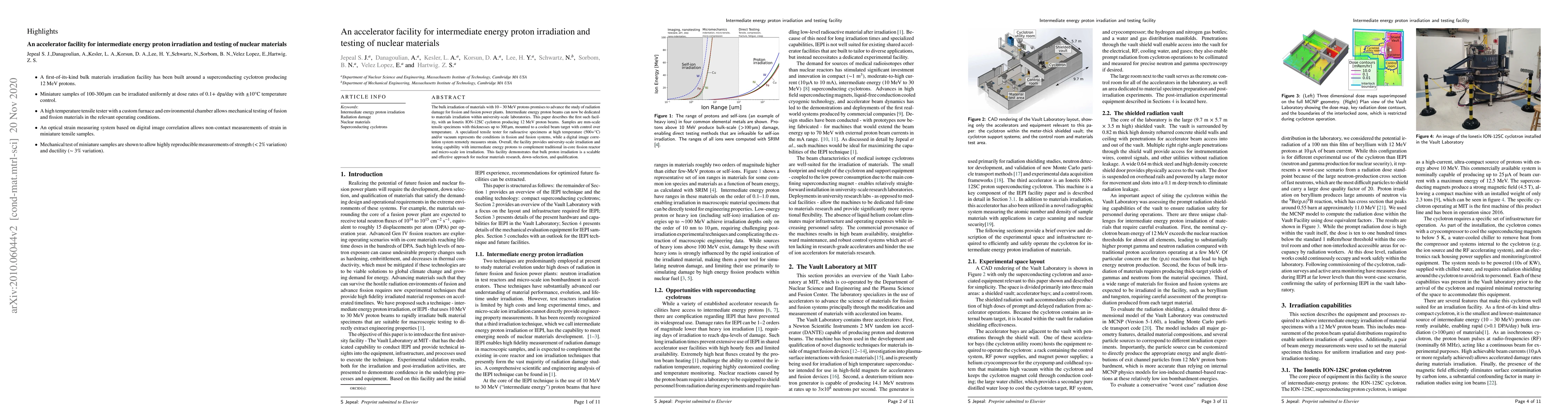 This paper introduces a university-scale facility using a 12 MeV proton beam cyclotron for irradiating and testing nuclear materials, enabling the study of radiation damage in fission and fusion power plants. The setup includes a specialized tensile tester for high-temperature and vacuum conditions, and a digital image correlation system for remote strain measurement.