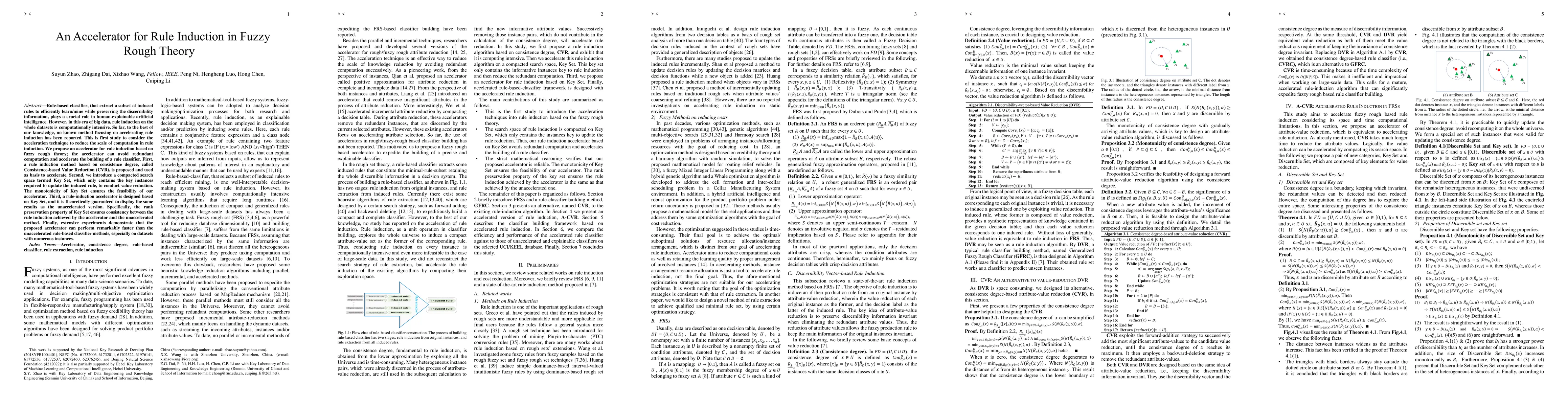 This paper proposes an accelerator for rule induction in fuzzy rough theory to reduce computational intensity in big data scenarios. The method introduces a Key Set to minimize redundant computation and ensures the same results as traditional methods, achieving significant speedups, especially on large datasets.