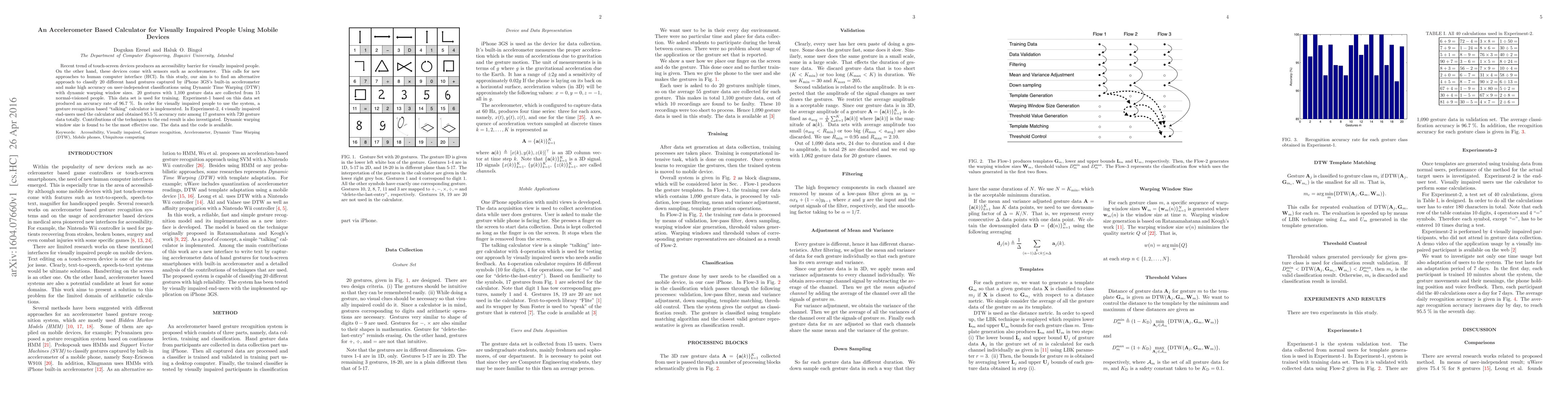 Recent trend of touch-screen devices produces an accessibility barrier for visually impaired people. On the other hand, these devices come with sensors such as accelerometer. This calls for new approaches to human computer interface (HCI). In this study, our aim is to find an alternative approach to classify 20 different hand gestures captured by iPhone 3GS's built-in accelerometer and make high accuracy on user-independent classifications using Dynamic Time Warping (DTW) with dynamic warping window sizes. 20 gestures with 1,100 gesture data are collected from 15 normal-visioned people. This data set is used for training. Experiment-1 based on this data set produced an accuracy rate of 96.7~\%. In order for visually impaired people to use the system, a gesture recognition based "talking" calculator is implemented. In Experiment-2, 4 visually impaired end-users used the calculator and obtained 95.5~\% accuracy rate among 17 gestures with 720 gesture data totally. Contributions of the techniques to the end result is also investigated. Dynamic warping window size is found to be the most effective one. The data and the code is available.