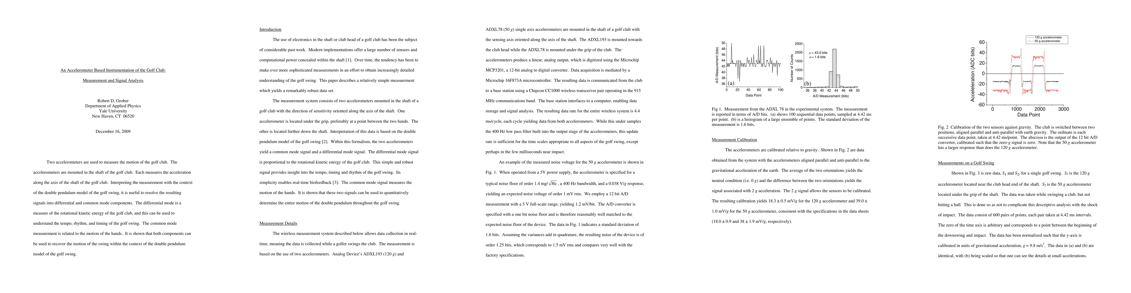 Two accelerometers are used to measure the motion of the golf club. The accelerometers are mounted in the shaft of the golf club. Each measures the acceleration along the axis of the shaft of the golf club. Interpreting the measurement with the context of the double pendulum model of the golf swing, it is useful to resolve the resulting signals into differential and common mode components. The differential mode is a measure of the rotational kinetic energy of the golf club, and this can be used to understand the tempo, rhythm, and timing of the golf swing. The common mode measurement is related to the motion of the hands. It is shown that both components can be used to recover the motion of the swing within the context of the double pendulum model of the golf swing.