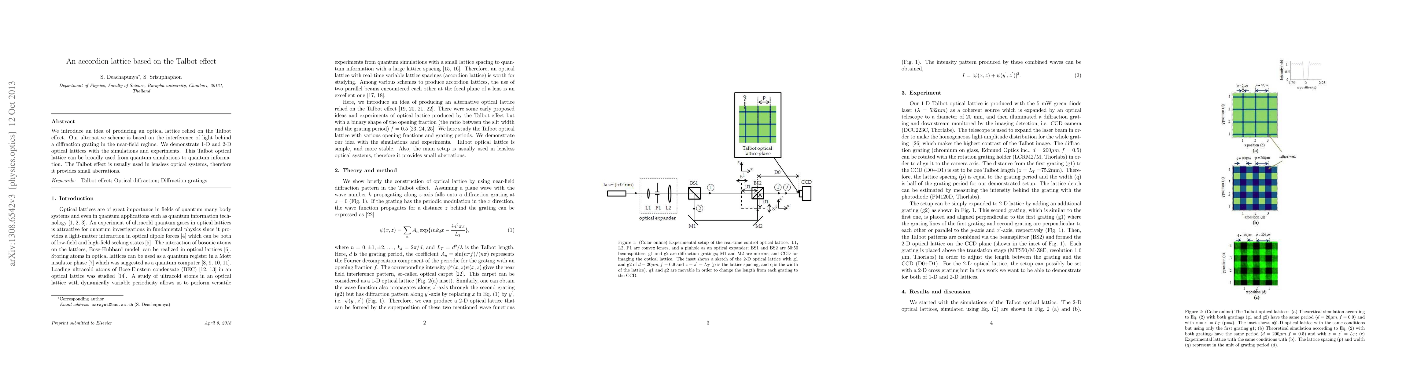 This paper proposes an innovative optical lattice based on the Talbot effect, utilizing near-field interference behind a diffraction grating. Simulations and experiments confirm the feasibility of 1-D and 2-D lattices, highlighting potential applications in quantum simulations and information.