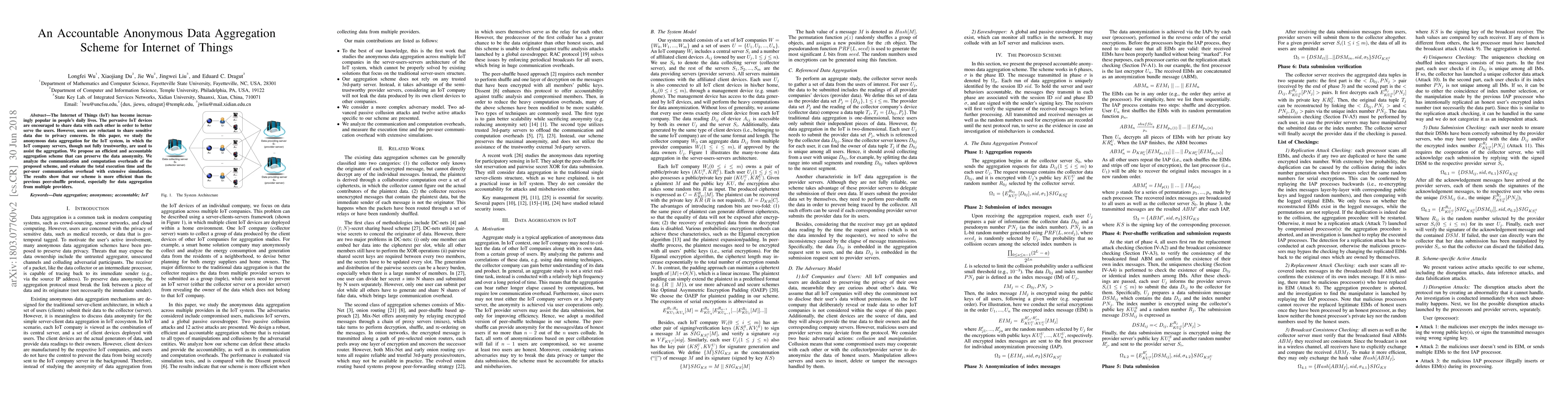 The Internet of Things (IoT) has become increasingly popular in people's daily lives. The pervasive IoT devices are encouraged to share data with each other in order to better serve the users. However, users are reluctant to share sensitive data due to privacy concerns. In this paper, we study the anonymous data aggregation for the IoT system, in which the IoT company servers, though not fully trustworthy, are used to assist the aggregation. We propose an efficient and accountable aggregation scheme that can preserve the data anonymity. We analyze the communication and computation overheads of the proposed scheme, and evaluate the total execution time and the per-user communication overhead with extensive simulations. The results show that our scheme is more efficient than the previous peer-shuffle protocol, especially for data aggregation from multiple providers.