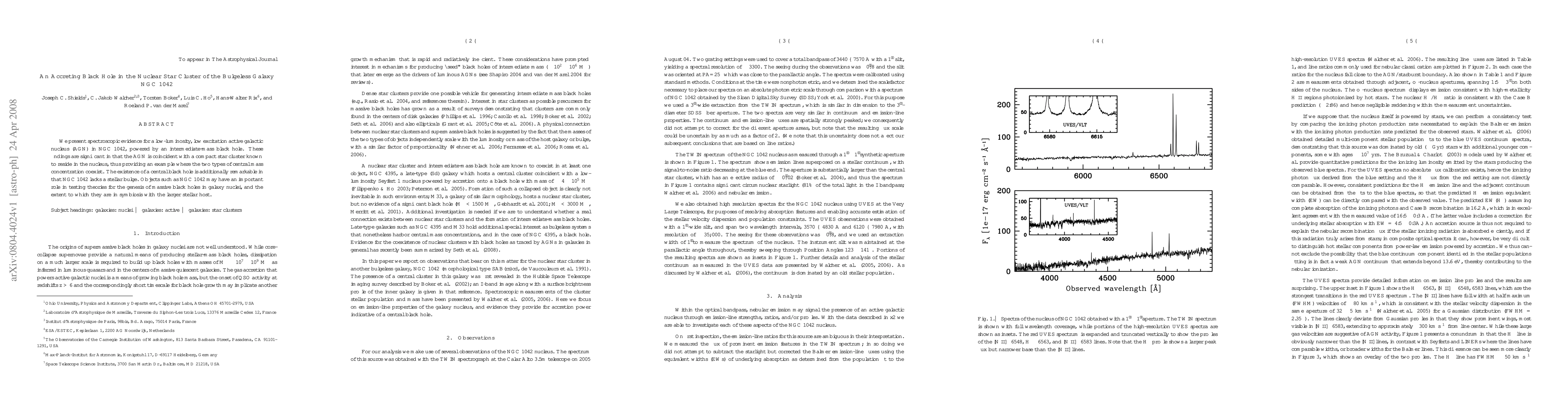We present spectroscopic evidence for a low-luminosity, low-excitation active galactic nucleus (AGN) in NGC 1042, powered by an intermediate-mass black hole. These findings are significant in that the AGN is coincident with a compact star cluster known to reside in the nucleus, thus providing an example where the two types of central mass concentration coexist. The existence of a central black hole is additionally remarkable in that NGC 1042 lacks a stellar bulge. Objects such as NGC 1042 may have an important role in testing theories for the genesis of massive black holes in galaxy nuclei, and the extent to which they are in symbiosis with the larger stellar host.