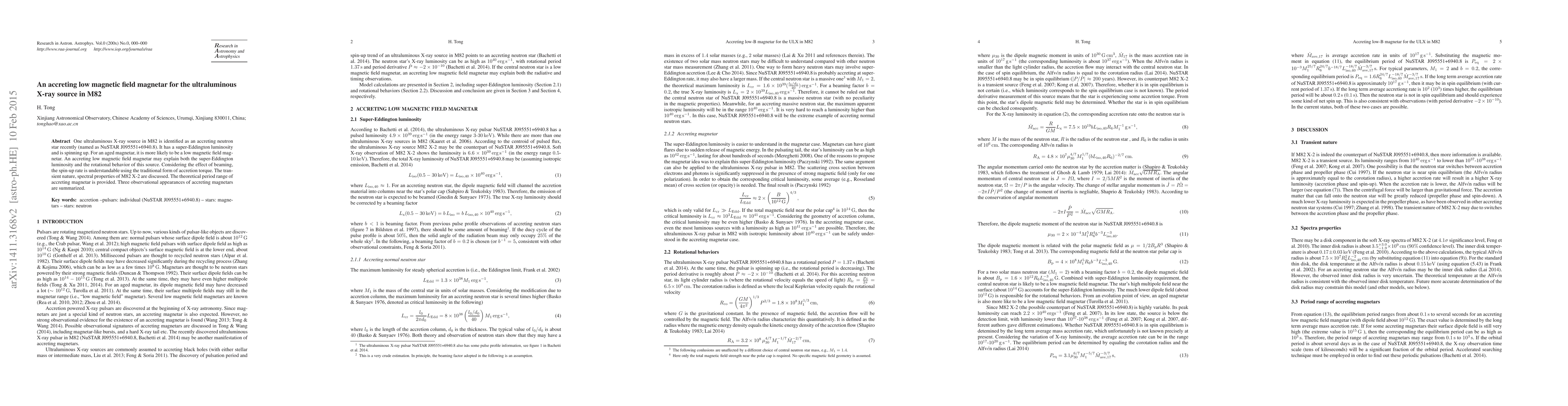 One ultraluminous X-ray source in M82 is identified as an accreting neutron star recently (named as NuSTAR J095551+6940.8). It has a super-Eddington luminosity and is spinning up. For an aged magnetar, it is more likely to be a low magnetic field magnetar. An accreting low magnetic field magnetar may explain both the super-Eddington luminosity and the rotational behavior of this source. Considering the effect of beaming, the spin-up rate is understandable using the traditional form of accretion torque. The transient nature, spectral properties of M82 X-2 are discussed. The theoretical period range of accreting magnetar is provided. Three observational appearances of accreting magnetars are summarized.