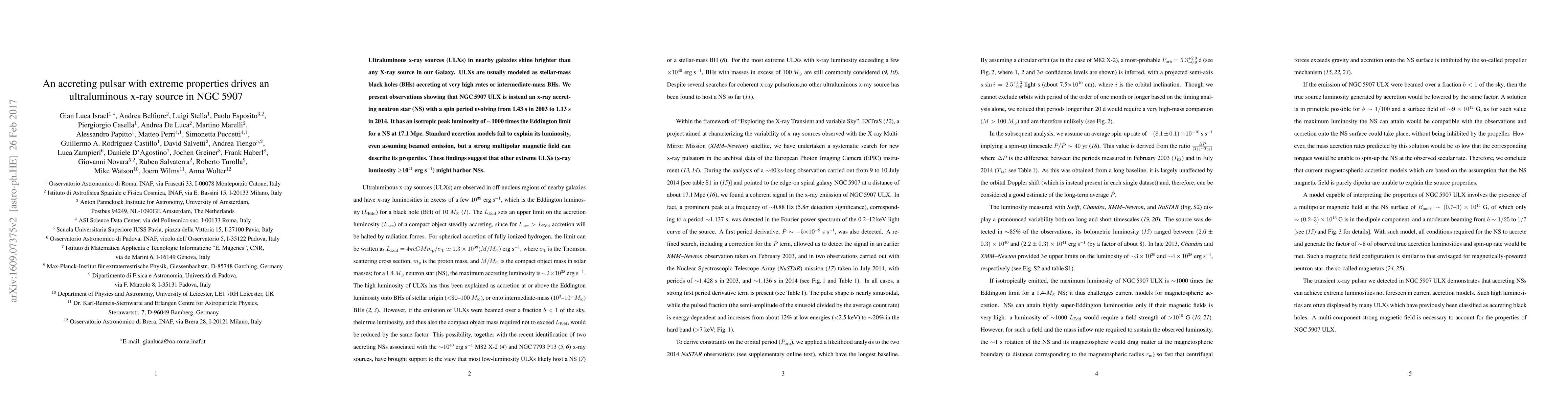 This paper identifies NGC 5907's ultraluminous X-ray source as an accreting neutron star, not a black hole, with an evolving spin period and extreme luminosity. A strong multipolar magnetic field is proposed to explain its unusual properties, suggesting similar neutron stars may exist in other extreme ultraluminous X-ray sources.