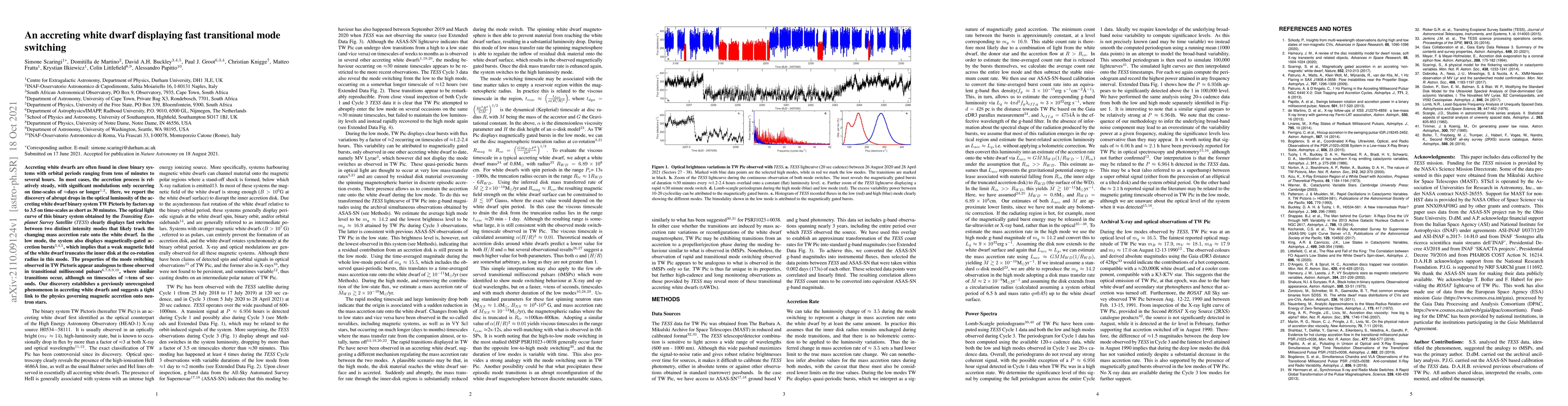 This paper reports the discovery of rapid, significant luminosity drops in the accreting white dwarf binary system TW Pictoris, observed by the TESS satellite, indicating fast transitional mode switching likely due to changing mass accretion rates. The low mode exhibits magnetically-gated accretion bursts, suggesting a weak magnetic field truncates the inner disk, analogous to phenomena seen in transitional millisecond pulsars.