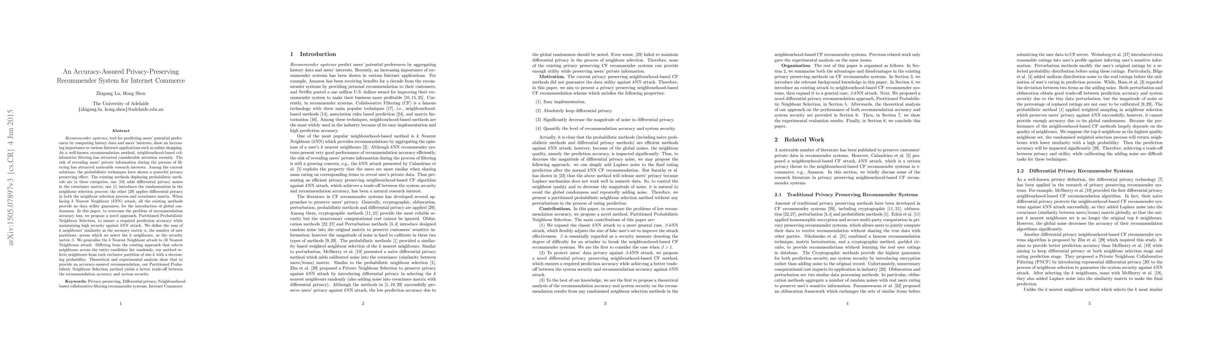 Recommender systems, tool for predicting users' potential preferences by computing history data and users' interests, show an increasing importance in various Internet applications such as online shopping. As a well-known recommendation method, neighbourhood-based collaborative filtering has attracted considerable attention recently. The risk of revealing users' private information during the process of filtering has attracted noticeable research interests. Among the current solutions, the probabilistic techniques have shown a powerful privacy preserving effect. When facing $k$ Nearest Neighbour attack, all the existing methods provide no data utility guarantee, for the introduction of global randomness. In this paper, to overcome the problem of recommendation accuracy loss, we propose a novel approach, Partitioned Probabilistic Neighbour Selection, to ensure a required prediction accuracy while maintaining high security against $k$NN attack. We define the sum of $k$ neighbours' similarity as the accuracy metric alpha, the number of user partitions, across which we select the $k$ neighbours, as the security metric beta. We generalise the $k$ Nearest Neighbour attack to beta k Nearest Neighbours attack. Differing from the existing approach that selects neighbours across the entire candidate list randomly, our method selects neighbours from each exclusive partition of size $k$ with a decreasing probability. Theoretical and experimental analysis show that to provide an accuracy-assured recommendation, our Partitioned Probabilistic Neighbour Selection method yields a better trade-off between the recommendation accuracy and system security.