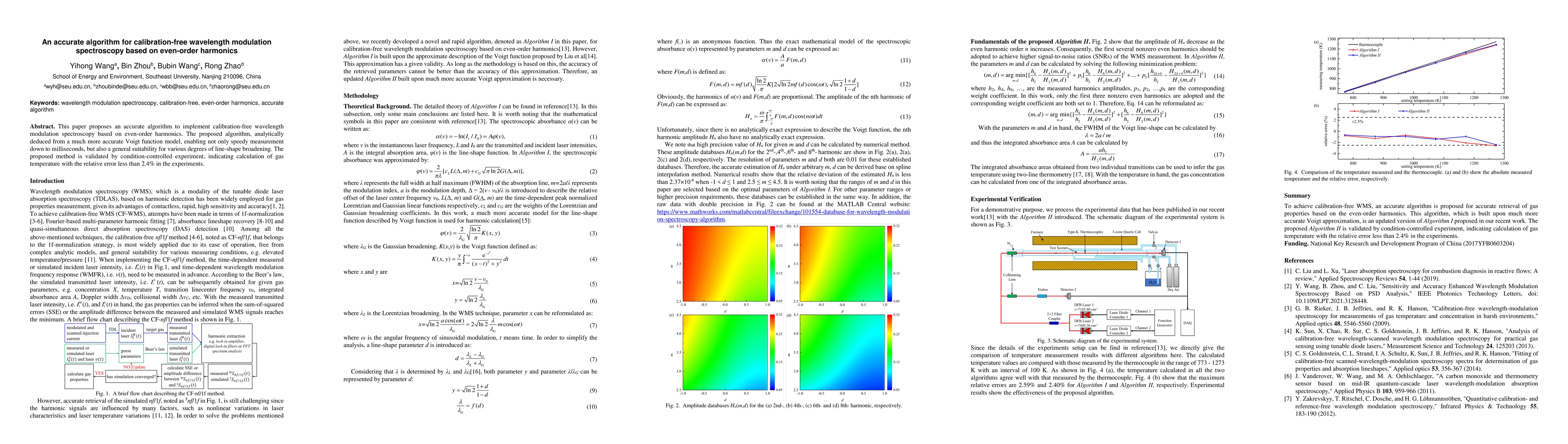 This paper proposes an accurate algorithm to implement calibration-free wavelength modulation spectroscopy based on even-order harmonics. The proposed algorithm, analytically deduced from a much more accurate Voigt function model, enabling not only speedy measurement down to milliseconds, but also a general suitability for various degrees of line-shape broadening. The proposed method is validated by condition-controlled experiment, indicating calculation of gas temperature with the relative error less than 2.4% in the experiments.