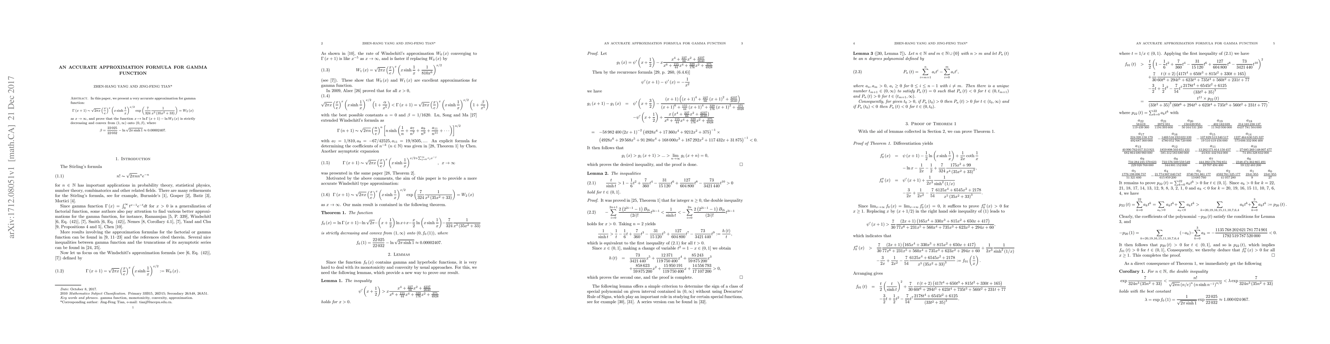 In this paper, we present a very accurate approximation for gamma function: \begin{equation*} \Gamma \left( x+1\right) \thicksim \sqrt{2\pi x}\left( \dfrac{x}{e}\right) ^{x}\left( x\sinh \frac{1}{x}\right) ^{x/2}\exp \left( \frac{7}{324}\frac{1}{ x^{3}\left( 35x^{2}+33\right) }\right) =W_{2}\left( x\right) \end{equation*} as $x\rightarrow \infty $, and prove that the function $x\mapsto \ln \Gamma \left( x+1\right) -\ln W_{2}\left( x\right) $ is strictly decreasing and convex from $\left( 1,\infty \right) $ onto $\left( 0,\beta \right) $, where \begin{equation*} \beta =\frac{22\,025}{22\,032}-\ln \sqrt{2\pi \sinh 1}\approx 0.00002407. \end{equation*}