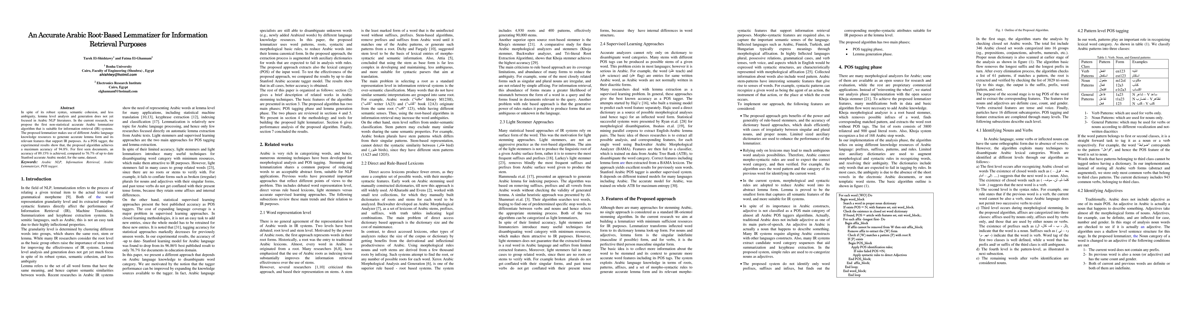The development of a root-based Arabic lemmatizer that generates accurate lemma forms and relevant morpho-syntactic features for IR purposes.