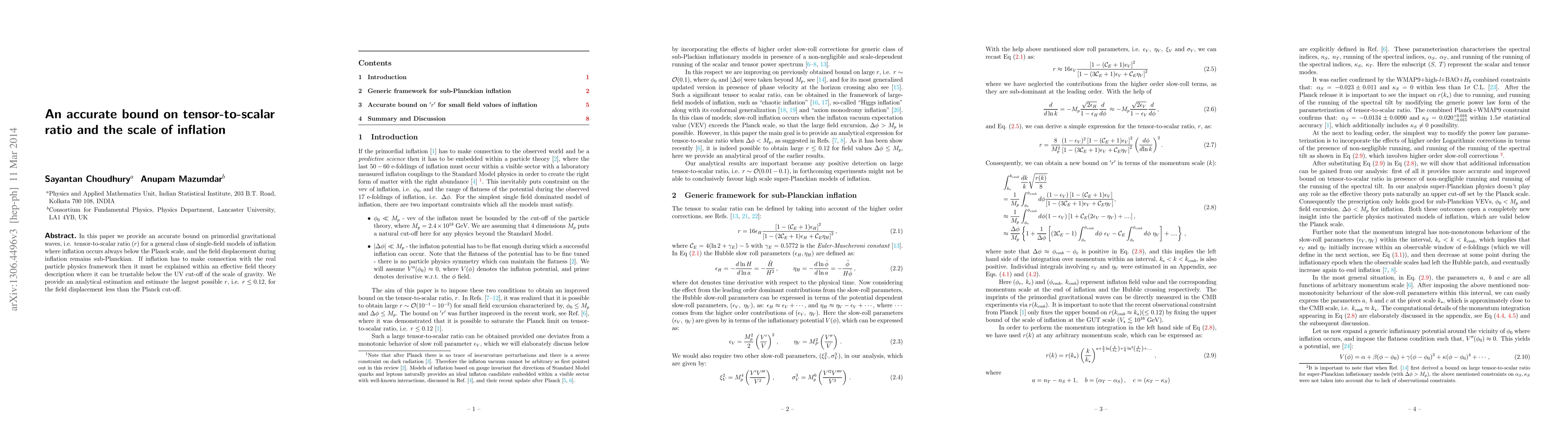 This paper establishes an accurate upper bound on the tensor-to-scalar ratio $(r)$ for single-field inflation models operating below the Planck scale, concluding that $r\leq 0.12$ for sub-Planckian field displacements, emphasizing the need for an effective field theory description for inflation.