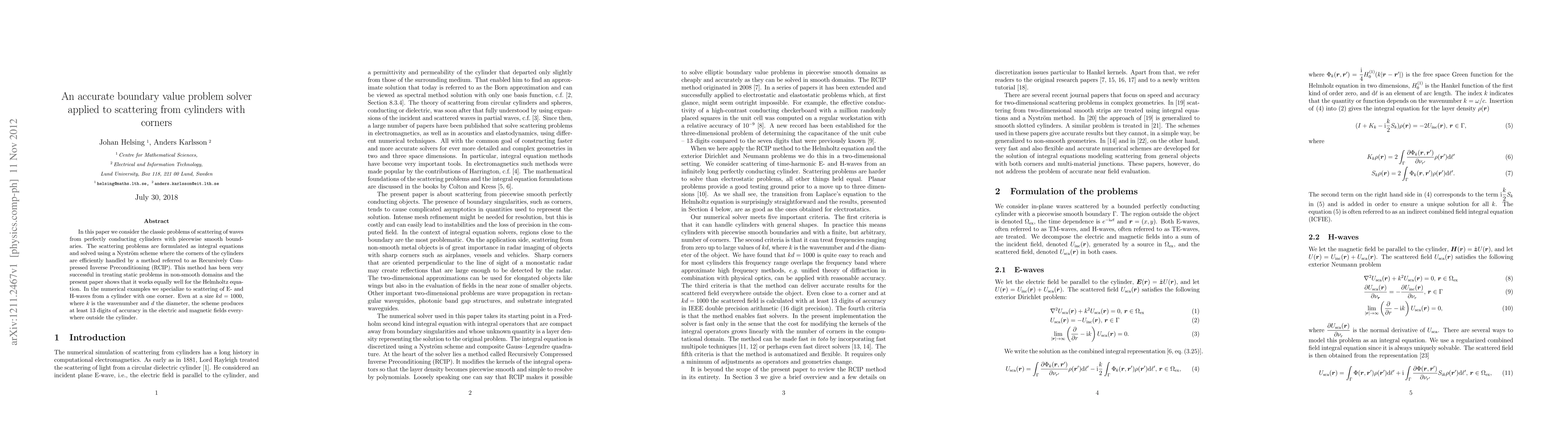 This paper presents a novel method, Recursively Compressed Inverse Preconditioning (RCIP), to solve integral equations arising from wave scattering problems around perfectly conducting cylinders with corners. The method demonstrates high accuracy, producing at least 13 digits accurate results for E- and H-waves even at large wavenumber-to-diameter ratios (kd=1000), showcasing its effectiveness for Helmholtz equation solutions in non-smooth domains.