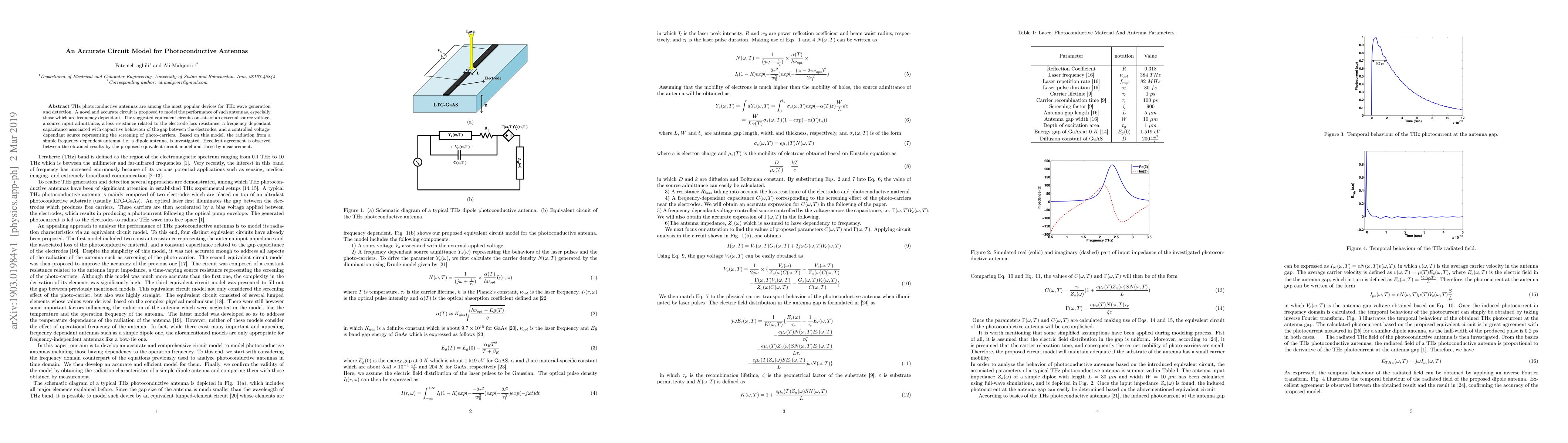 THz photoconductive antennas are among the most popular devices for THz wave generation and detection. A novel and accurate circuit is proposed to model the performance of such antennas, especially those which are frequency dependant. The suggested equivalent circuit consists of an external source voltage, a source input admittance, a loss resistance related to the electrode loss resistance, a frequency-dependant capacitance associated with capacitive behavior of the gap between the electrodes, and a controlled voltage dependant source representing the screening of photo-carriers. Based on this model, the radiation from a simple frequency dependent antenna, i.e. a dipole antenna, is investigated. Excellent agreement is observed between the obtained results by the proposed equivalent circuit model and those by measurement.