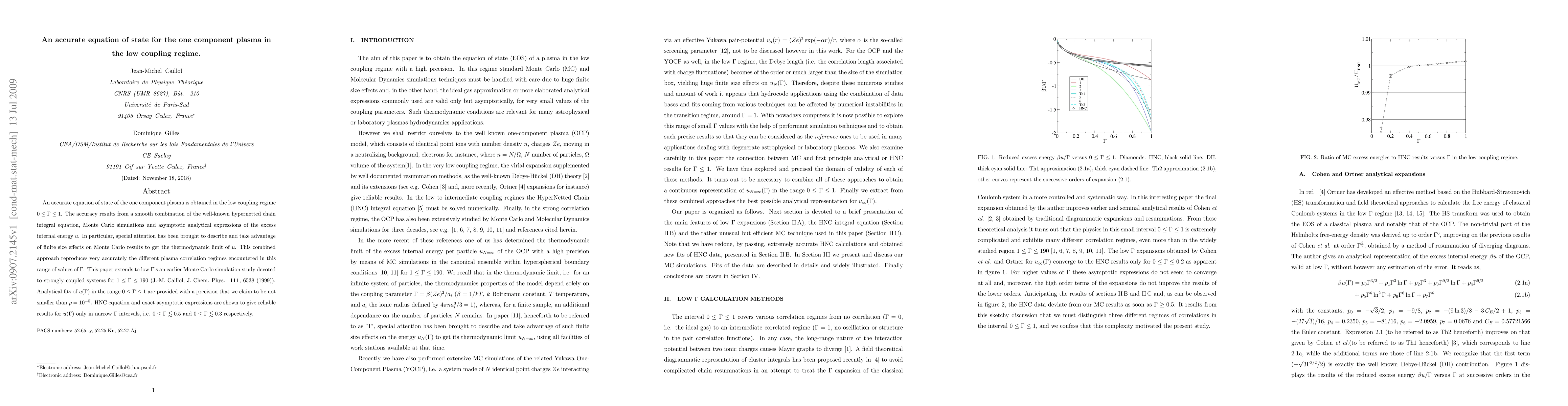 An accurate equation of state of the one component plasma is obtained in the low coupling regime $0 \leq \Gamma \leq 1$. The accuracy results from a smooth combination of the well-known hypernetted chain integral equation, Monte Carlo simulations and asymptotic analytical expressions of the excess internal energy $u$. In particular, special attention has been brought to describe and take advantage of finite size effects on Monte Carlo results to get the thermodynamic limit of $u$. This combined approach reproduces very accurately the different plasma correlation regimes encountered in this range of values of $\Gamma$. This paper extends to low $\Gamma$'s an earlier Monte Carlo simulation study devoted to strongly coupled systems for $1 \leq \Gamma \leq 190$ ({J.-M. Caillol}, {J. Chem. Phys.} \textbf{111}, 6538 (1999)). Analytical fits of $u(\Gamma)$ in the range $0 \leq \Gamma \leq 1$ are provided with a precision that we claim to be not smaller than $p= 10^{-5}$. HNC equation and exact asymptotic expressions are shown to give reliable results for $u(\Gamma)$ only in narrow $\Gamma$ intervals, i.e. $0 \leq \Gamma \lesssim 0.5$ and $0 \leq \Gamma \lesssim 0.3$ respectively.