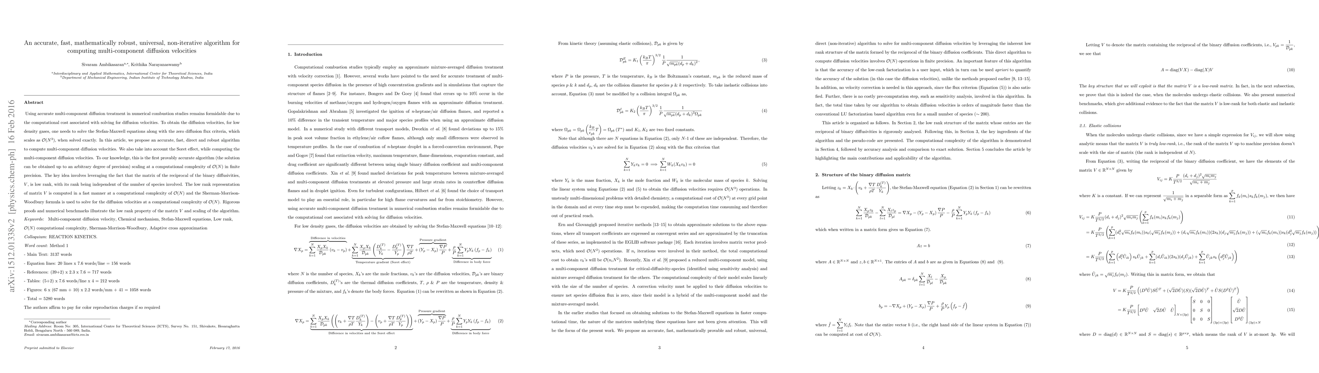 Using accurate multi-component diffusion treatment in numerical combustion studies remains formidable due to the computational cost associated with solving for diffusion velocities. To obtain the diffusion velocities, for low density gases, one needs to solve the Stefan-Maxwell equations along with the zero diffusion flux criteria, which scales as $\mathcal{O}(N^3)$, when solved exactly. In this article, we propose an accurate, fast, direct and robust algorithm to compute multi-component diffusion velocities. To our knowledge, this is the first provably accurate algorithm (the solution can be obtained up to an arbitrary degree of precision) scaling at a computational complexity of $\mathcal{O}(N)$ in finite precision. The key idea involves leveraging the fact that the matrix of the reciprocal of the binary diffusivities, $V$, is low rank, with its rank being independent of the number of species involved. The low rank representation of matrix $V$ is computed in a fast manner at a computational complexity of $\mathcal{O}(N)$ and the Sherman-Morrison-Woodbury formula is used to solve for the diffusion velocities at a computational complexity of $\mathcal{O}(N)$. Rigorous proofs and numerical benchmarks illustrate the low rank property of the matrix $V$ and scaling of the algorithm.