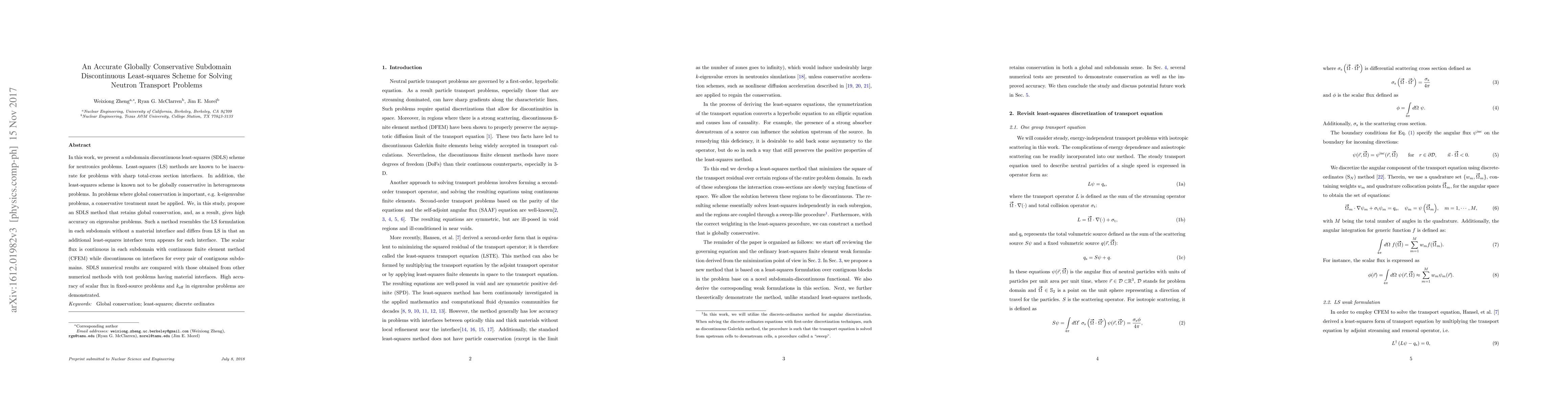 The research proposes a subdomain discontinuous least-squares (SDLS) method for solving neutron transport problems, which maintains global conservation while retaining the local least-squares formulation in each subdomain without material interfaces.