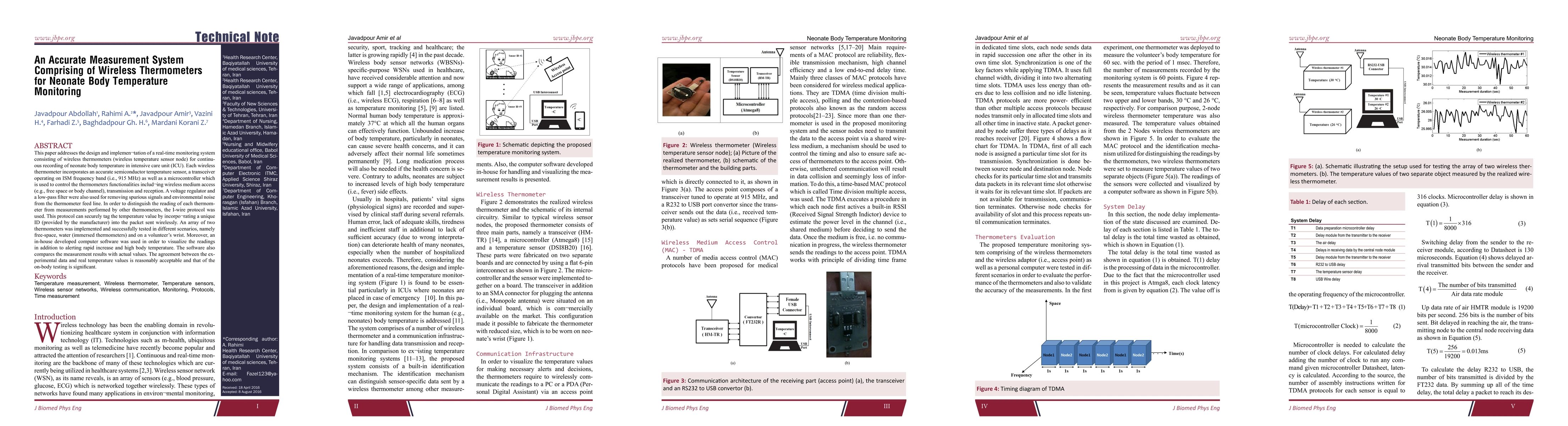 This paper addresses the design and implementation of a real-time monitoring system consisting of wireless thermometers for continuous recording of neonate body temperature in an intensive care unit (ICU). Each wireless thermometer incorporates an accurate semiconductor temperature sensor, a transceiver operating on ISM frequency band (i.e., 915 MHz) as well as a microcontroller which is used to control the thermometers functionalities including wireless medium access (e.g., free space or body channel), transmission and reception. A voltage regulator and a low-pass filter were also used for removing spurious signals and environmental noise from the thermometer feed line. In order to distinguish the reading of each thermometer from measurements performed by other thermometers, the I-wire protocol was used. This protocol can securely tag the temperature value by incorporating a unique ID (provided by the manufacturer) into the packet sent wirelessly. An array of two thermometers was implemented and successfully tested in different scenarios, namely free-space, water (immersed thermometers) and on a volunteers wrist. Moreover, an in-house developed computer software was used in order to visualize the readings in addition to alerting rapid increase and high body temperature. The software also compares the measurement results with actual values. The agreement between the experimental data and real temperature values is reasonably acceptable and that of the on-body testing is significant. Keywords : Temperature measurement, Wireless thermometer, Temperature sensors, Wireless sensor networks, Wireless communication, Monitoring, Protocols, Time measurement