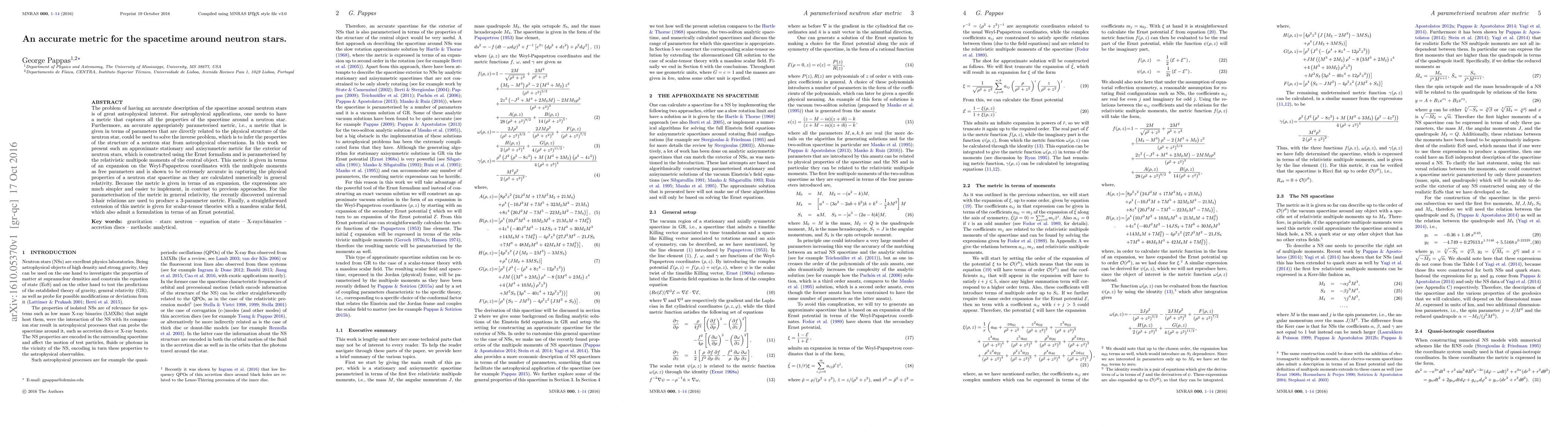 The problem of having an accurate description of the spacetime around neutron stars is of great astrophysical interest. For astrophysical applications, one needs to have a metric that captures all the properties of the spacetime around a neutron star. Furthermore, an accurate appropriately parameterised metric, i.e., a metric that is given in terms of parameters that are directly related to the physical structure of the neutron star, could be used to solve the inverse problem, which is to infer the properties of the structure of a neutron star from astrophysical observations. In this work we present such an approximate stationary and axisymmetric metric for the exterior of neutron stars, which is constructed using the Ernst formalism and is parameterised by the relativistic multipole moments of the central object. This metric is given in terms of an expansion on the Weyl-Papapetrou coordinates with the multipole moments as free parameters and is shown to be extremely accurate in capturing the physical properties of a neutron star spacetime as they are calculated numerically in general relativity. Because the metric is given in terms of an expansion, the expressions are much simpler and easier to implement, in contrast to previous approaches. For the parameterisation of the metric in general relativity, the recently discovered universal 3-hair relations are used to produce a 3-parameter metric. Finally, a straightforward extension of this metric is given for scalar-tensor theories with a massless scalar field, which also admit a formulation in terms of an Ernst potential.