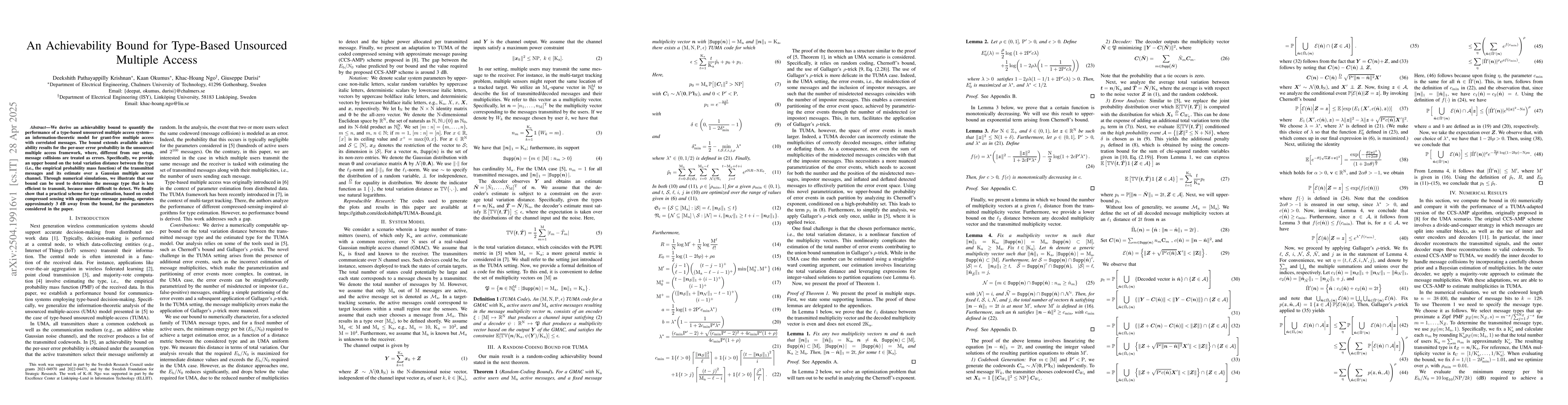 The paper derives an achievability bound for a type-based unsourced multiple access system using Gaussian multiple access channels, employing coded compressed sensing with approximate message passing for type estimation.