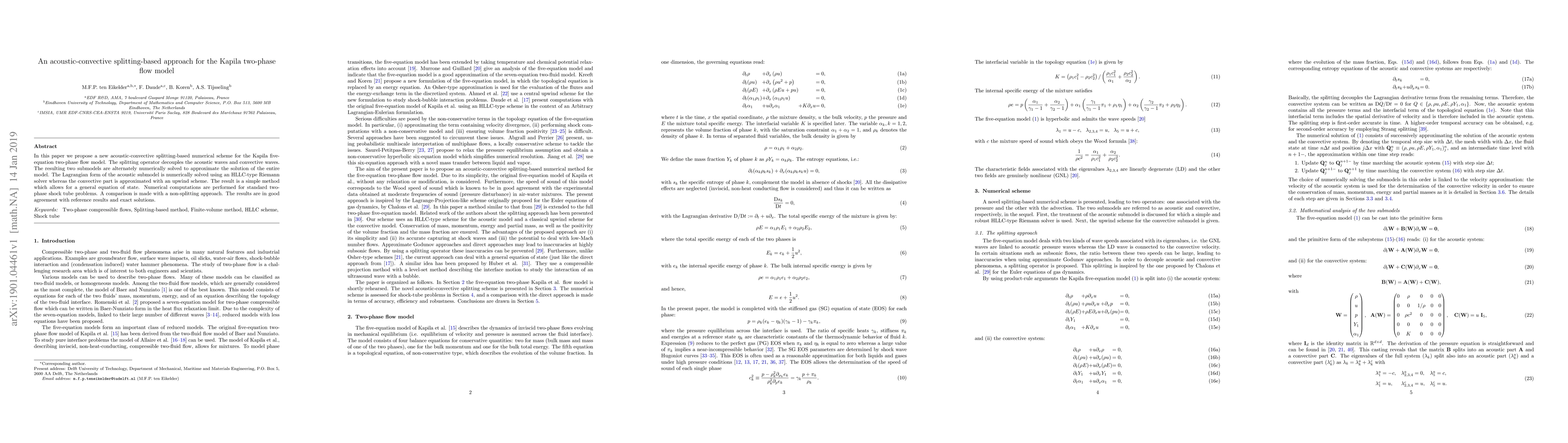 This paper introduces a novel acoustic-convective splitting method for the Kapila two-phase flow model, decoupling acoustic and convective waves. The approach, validated through shock tube tests, offers a simpler solution with general equation of state applicability, showing good agreement with reference results.