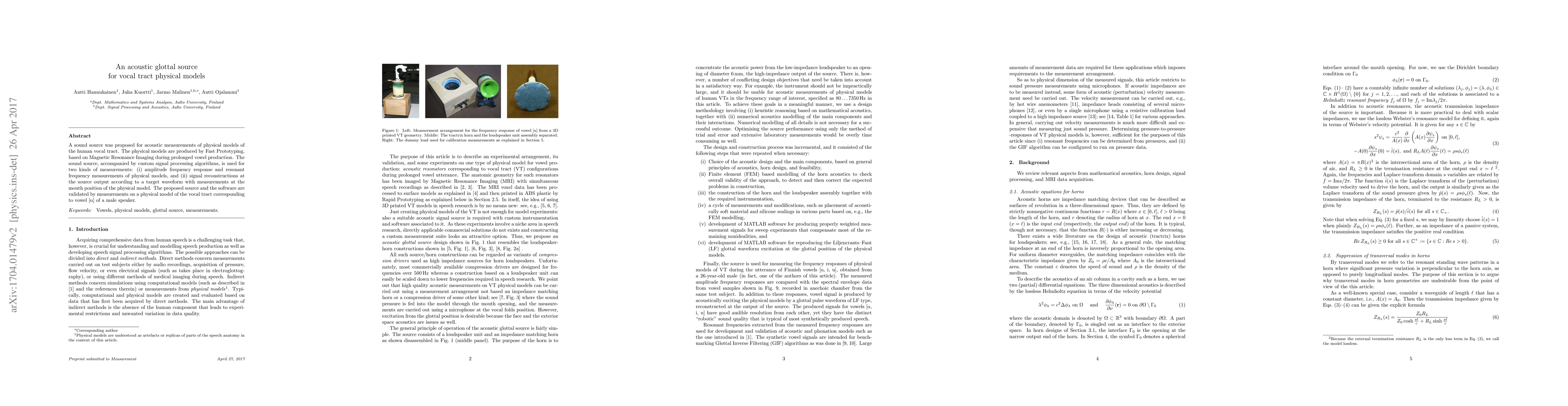 This paper proposes an acoustic glottal source for measuring physical models of the human vocal tract, created via Fast Prototyping and MRI. It validates the source through amplitude frequency response and signal reconstructions, using a model corresponding to the vowel [a] from a male speaker.