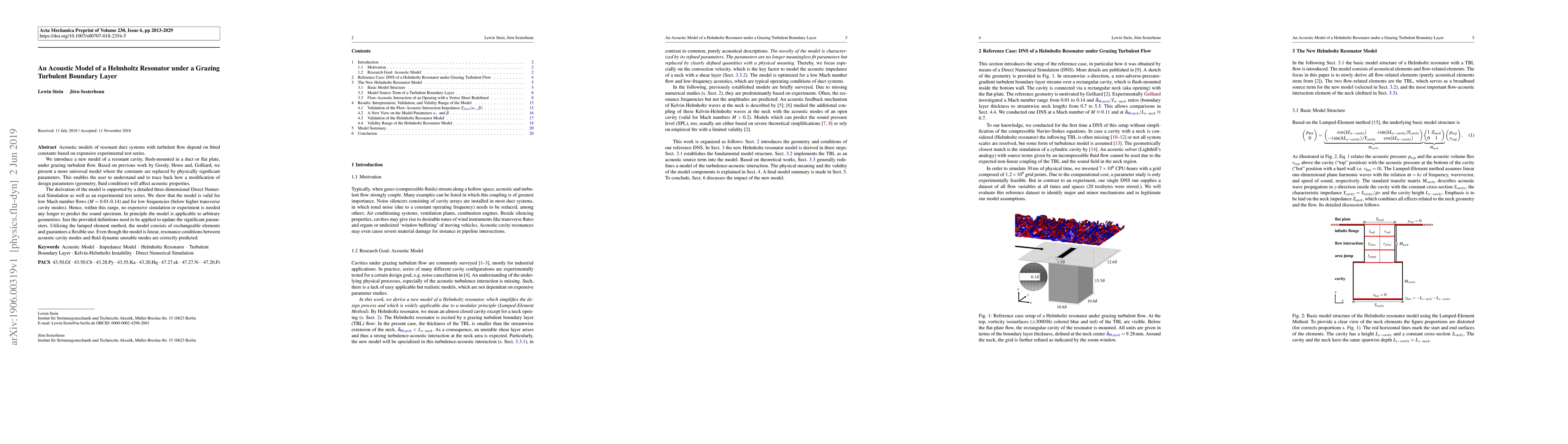 A new acoustic model for a Helmholtz resonator under turbulent flow is introduced, enabling users to predict sound properties without expensive simulations or experiments, with valid results for low Mach number flows and frequencies.