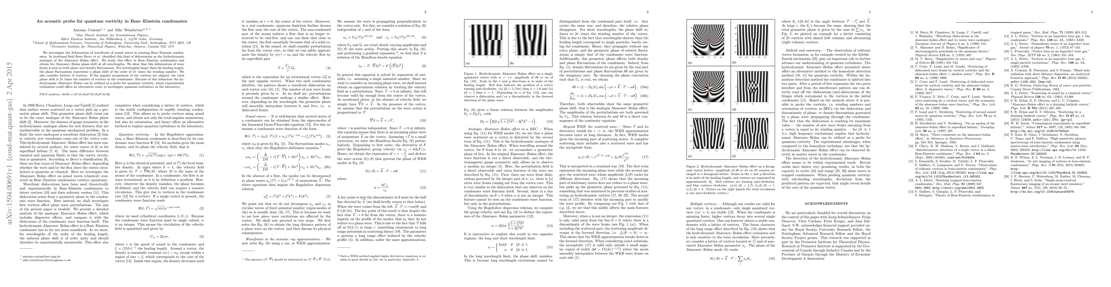 This paper investigates the deformation of sound waves in rotating Bose-Einstein condensates, identifying it as the hydrodynamic analogue of the Aharonov-Bohm effect. The study reveals a phase shift proportional to the winding number and vortex alignment, demonstrating the potential of this effect as a probe for quantum vorticity and quantum turbulence.