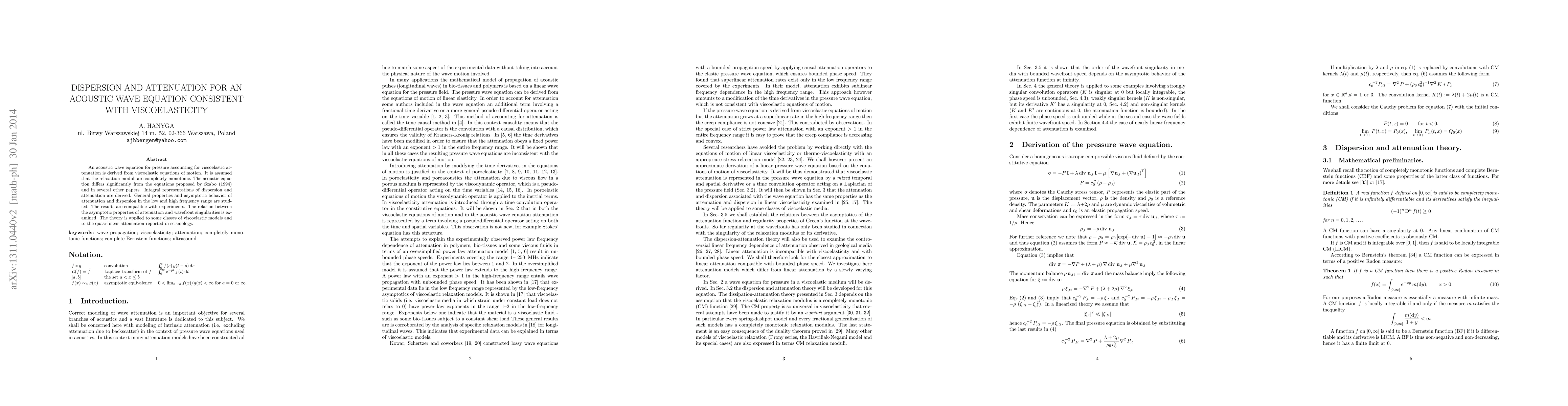 An acoustic wave equation for pressure accounting for viscoelastic attenuation is derived from viscoelastic equations of motion. It is assumed that the relaxation moduli are completely monotonic. The acoustic equation differs significantly from the equations proposed by Szabo (1994) and in several other papers. Integral representations of dispersion and attenuation are derived. General properties and asymptotic behavior of attenuation and dispersion in the low and high frequency range are studied. The results are compatible with experiments. The relation between the asymptotic properties of attenuation and wavefront singularities is examined. The theory is applied to some classes of viscoelastic models and to the quasi-linear attenuation reported in seismology.