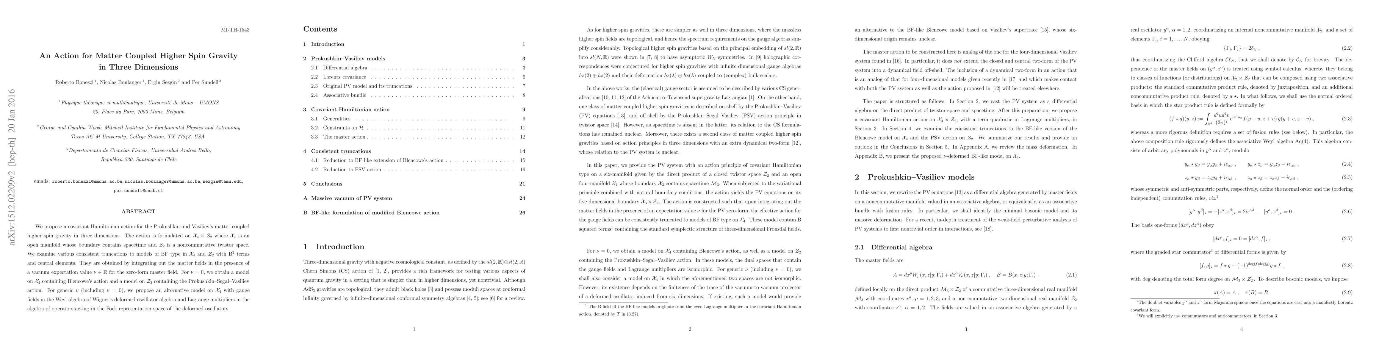We propose a covariant Hamiltonian action for the Prokushkin and Vasiliev's matter coupled higher spin gravity in three dimensions. The action is formulated on ${\cal X}_4 \times {\cal Z}_2$ where ${\cal X}_4$ is an open manifold whose boundary contains spacetime and ${\cal Z}_2$ is a noncommutative twistor space. We examine various consistent truncations to models of BF type in ${\cal X}_4$ and ${\cal Z}_2$ with B$^2$ terms and central elements. They are obtained by integrating out the matter fields in the presence of a vacuum expectation value $\nu\in \mathbb{R}$ for the zero-form master field. For $\nu=0$, we obtain a model on ${\cal X}_4$ containing Blencowe's action and a model on ${\cal Z}_2$ containing the Prokushkin--Segal--Vasiliev action. For generic $\nu$ (including $\nu=0$), we propose an alternative model on ${\cal X}_4$ with gauge fields in the Weyl algebra of Wigner's deformed oscillator algebra and Lagrange multipliers in the algebra of operators acting in the Fock representation space of the deformed oscillators.