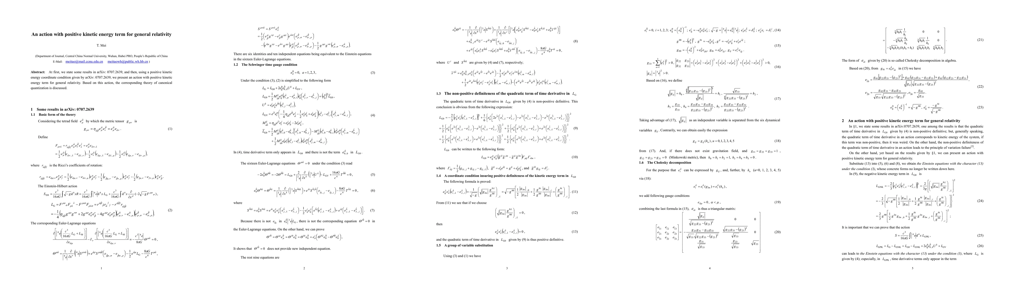 At first, we state some results in arXiv: 0707.2639, and then, using a positive kinetic energy coordinate condition given by arXiv: 0707.2639, we present an action with positive kinetic energy term for general relativity. Based on this action, the corresponding theory of canonical quantization is discussed.