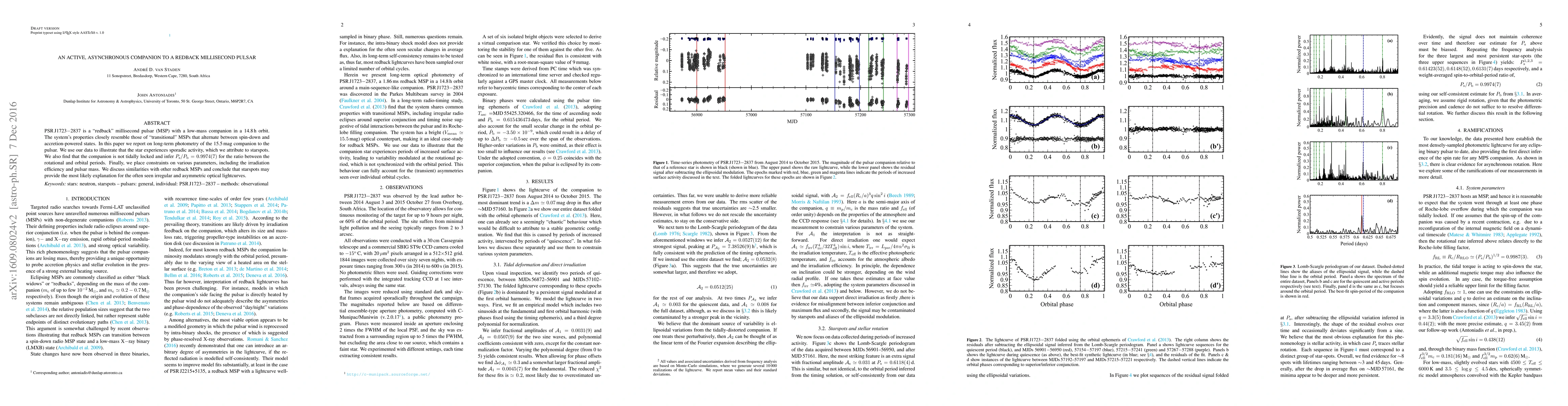 PSR\,J1723$-$2837 is a "redback" millisecond pulsar (MSP) with a low-mass companion in a 14.8\,h orbit. The system's properties closely resemble those of "transitional" MSPs that alternate between spin-down and accretion-powered states. In this paper we report on long-term photometry of the 15.5\,mag companion to the pulsar. We use our data to illustrate that the star experiences sporadic activity, which we attribute to starspots. We also find that the companion is not tidally locked and infer $P_{\rm s}/P_{\rm b}= 0.9974(7)$ for the ratio between the rotational and orbital periods. Finally, we place constraints on various parameters, including the irradiation efficiency and pulsar mass. We discuss similarities with other redback MSPs and conclude that starspots may provide the most likely explanation for the often seen irregular and asymmetric optical lightcurves.