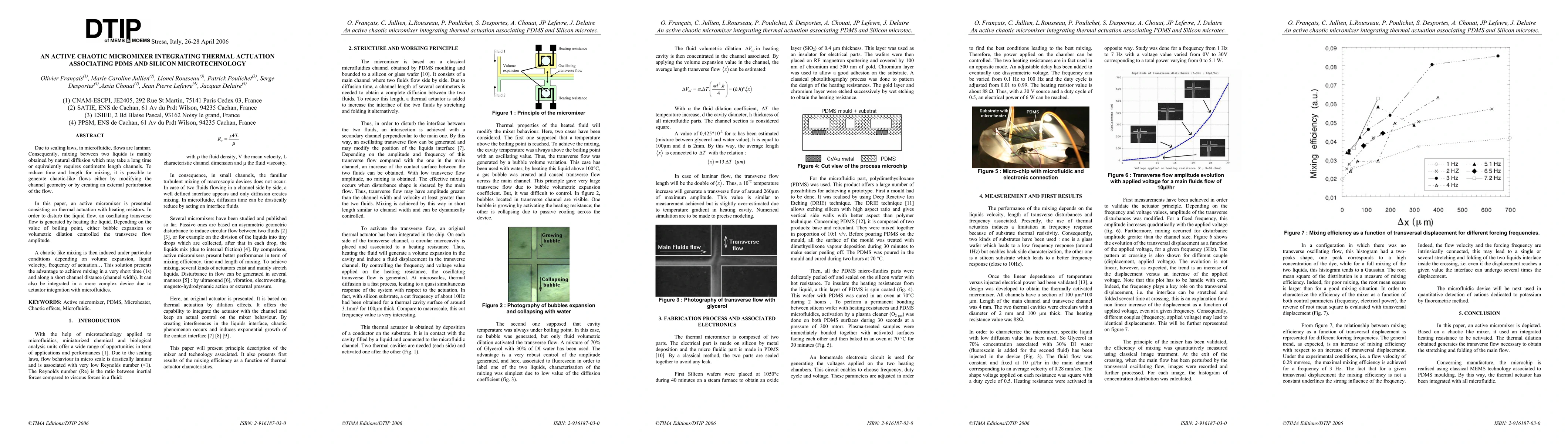 This paper presents an active chaotic micromixer using thermal actuation to induce mixing in microfluidic channels, achieving rapid mixing in a short distance by generating oscillating transverse flows through heating. The design integrates PDMS and silicon microtechnology for efficient and compact integration.