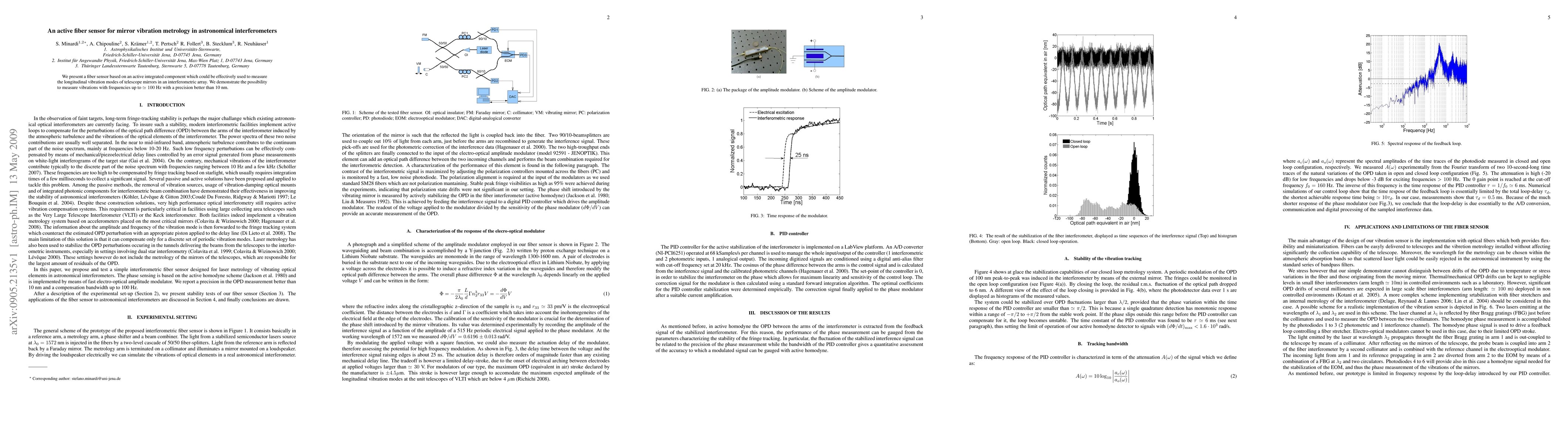 We present a fiber sensor based on an active integrated component which could be effectively used to measure the longitudinal vibration modes of telescope mirrors in an interferometric array. We demonstrate the possibility to measure vibrations with frequencies up to $\simeq 100$ Hz with a precision better than 10 nm.